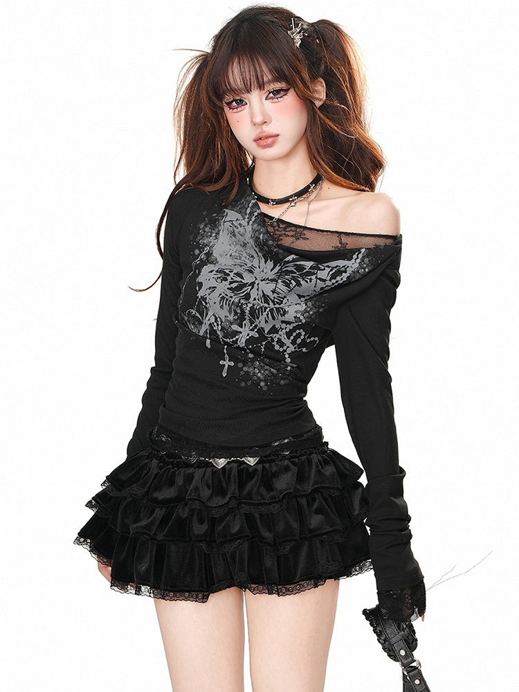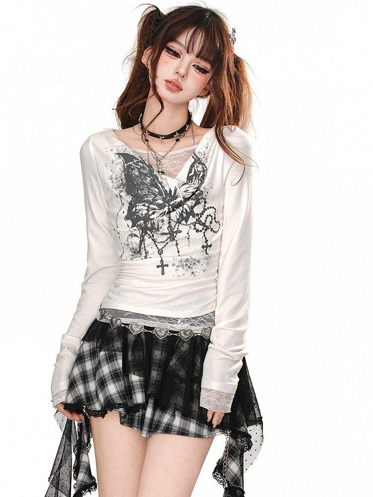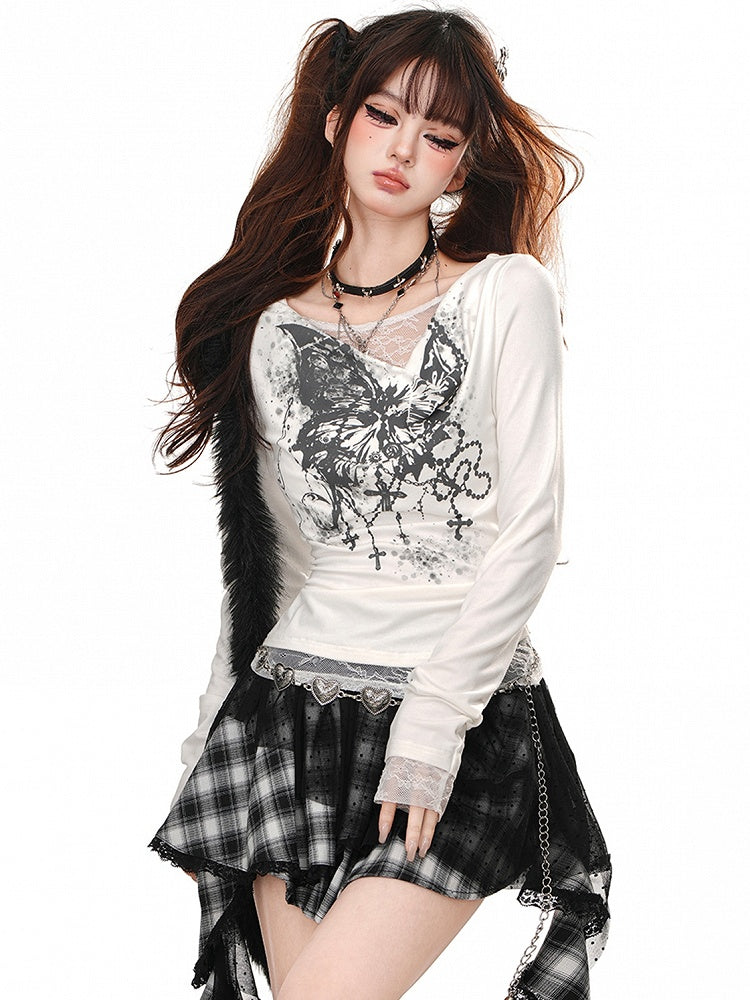 Schwarz/weißes Oberteil mit Schmetterlingsdruck und asymmetrischem Ausschnitt und langen Ärmeln