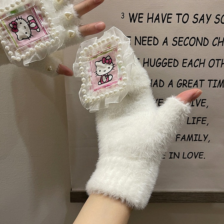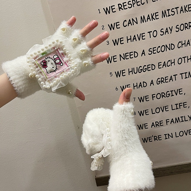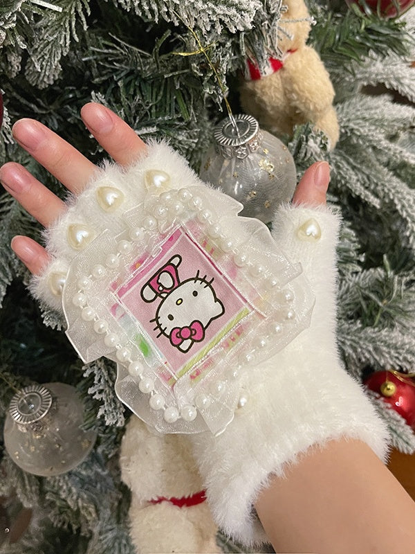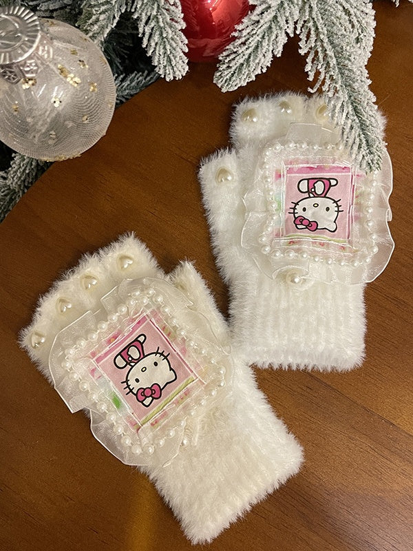 Schwarz/Weiße Plüschhandschuhe mit süßem Kätzchen-Print, Herzperlen, Spitzendetails