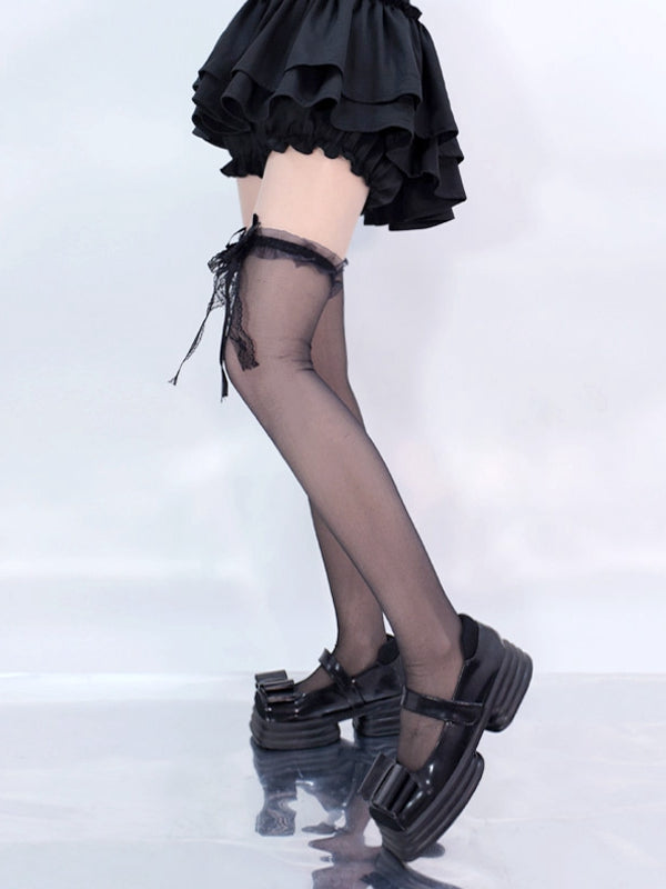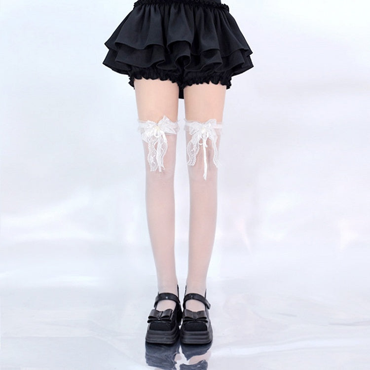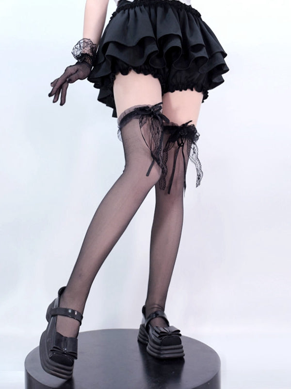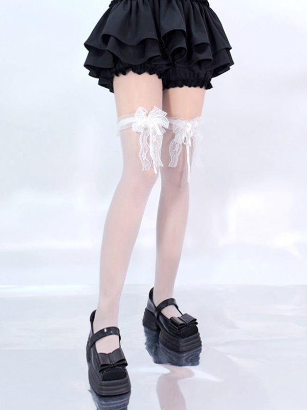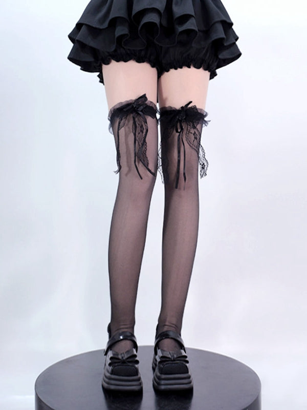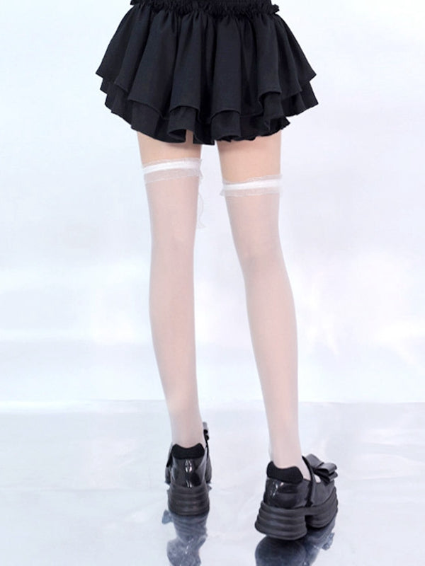 Schwarz/Weiße Overknee-Strümpfe mit Spitzenschleife an den Bündchen