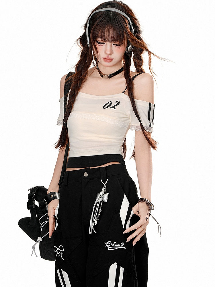 Schwarz/weißes Cami-Top mit Spitzenbesatz
