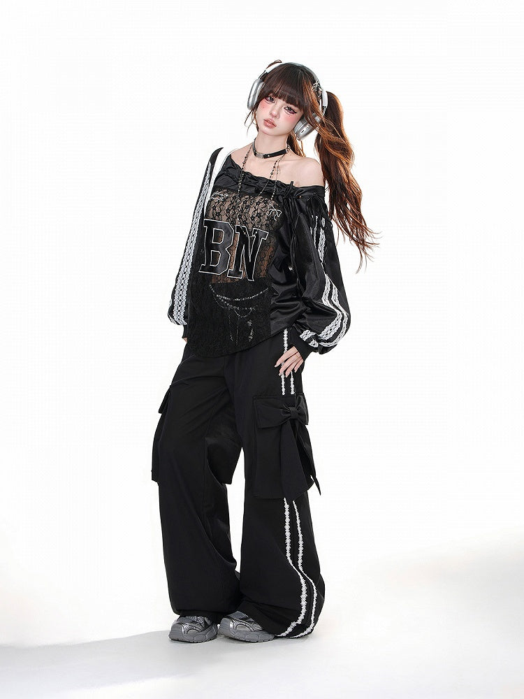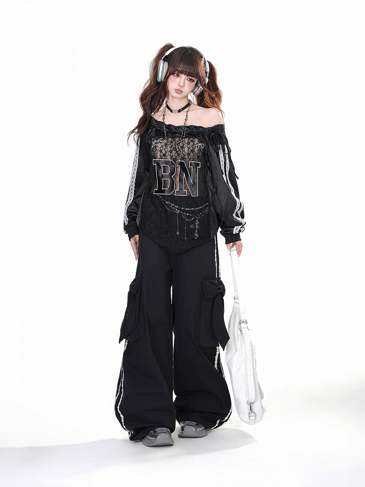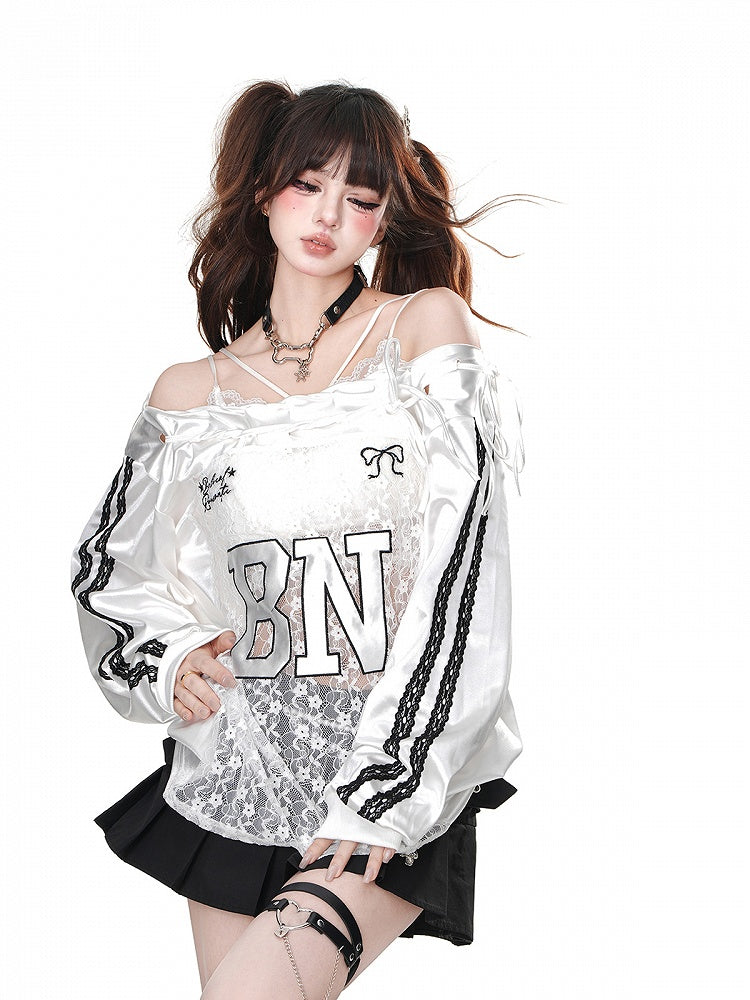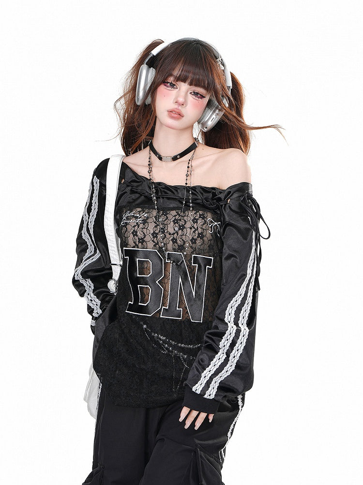 Dieses schwarz-weiße Top mit schulterfreiem Ausschnitt besticht durch sein kontrastierendes Spitzendesign und verleiht Ihrem Look einen Hauch von Weiblichkeit. Die lockere Passform bietet Komfort und Vielseitigkeit, während der schulterfreie Ausschnitt Ihre Schultern auf süße und charmante Weise in Szene setzt. Perfekt für alle, die mit ihrem einzigartigen Stil auffallen möchten.