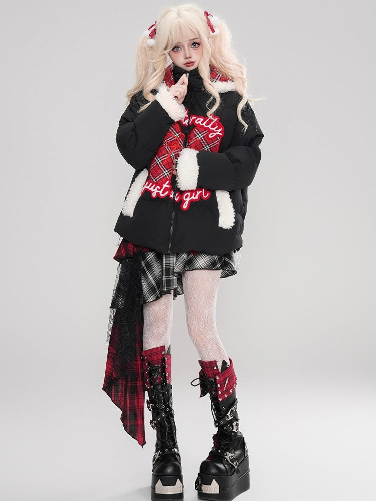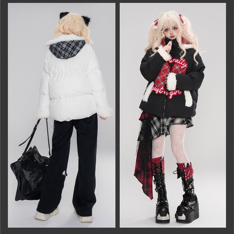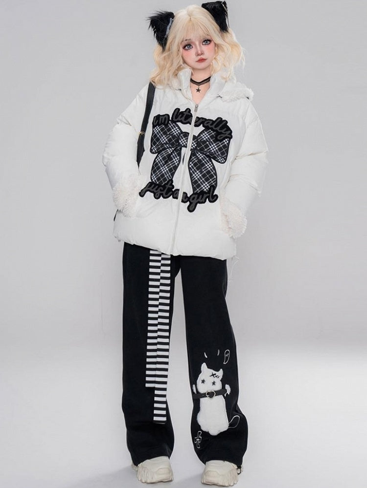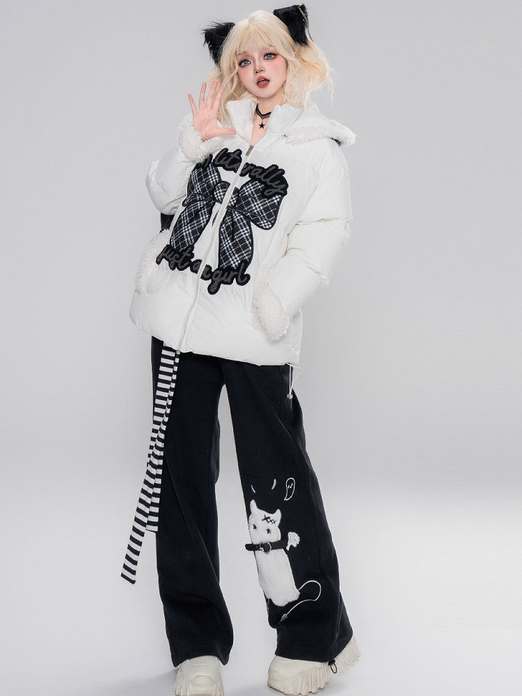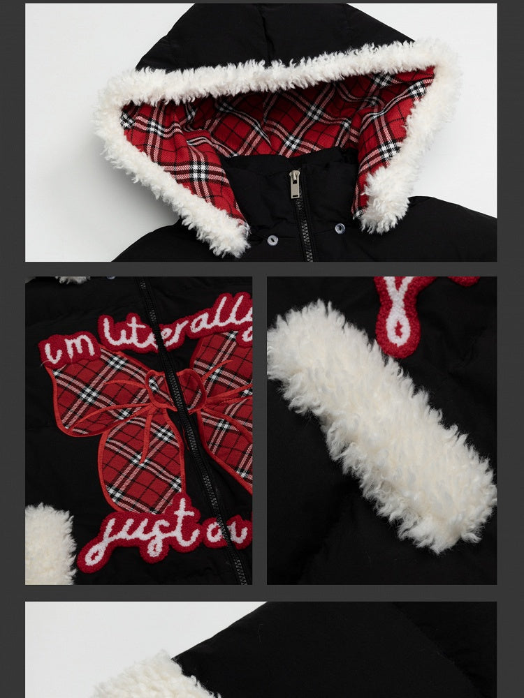 Schwarz/Weiß bezahlte Pufferjacke mit Schleifenapplikation und Kapuze, Plüschmanschetten