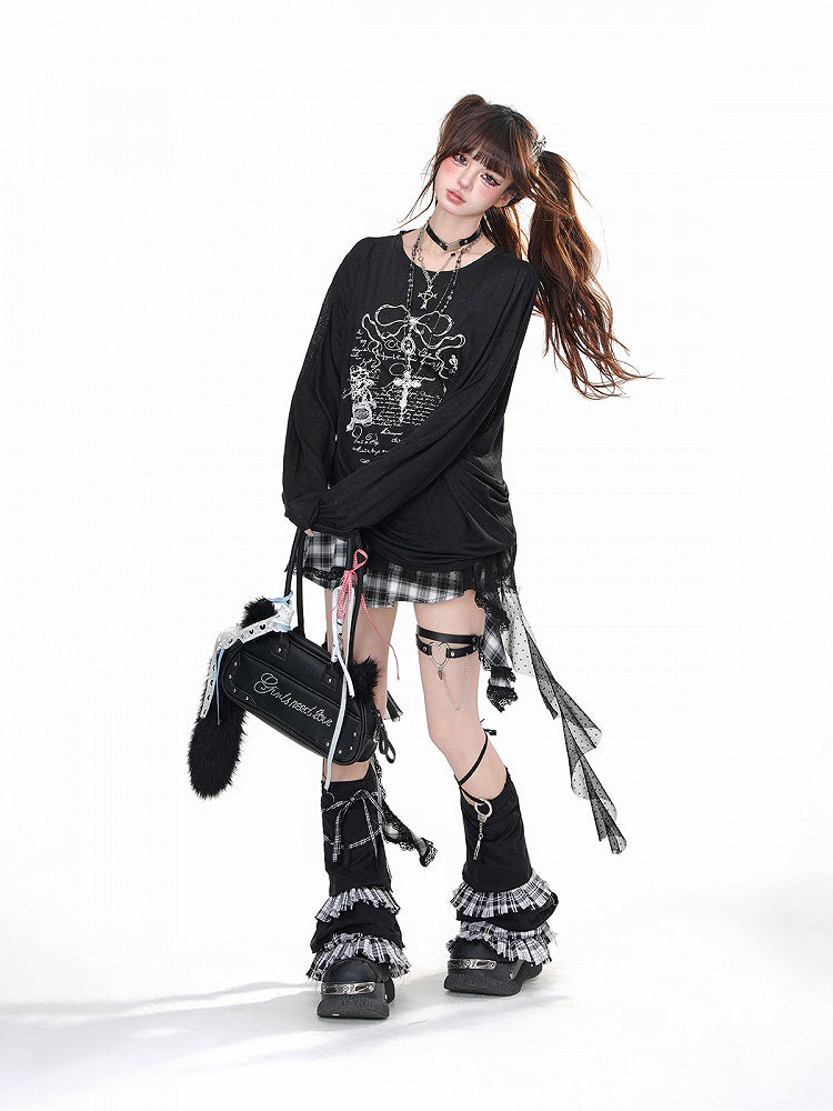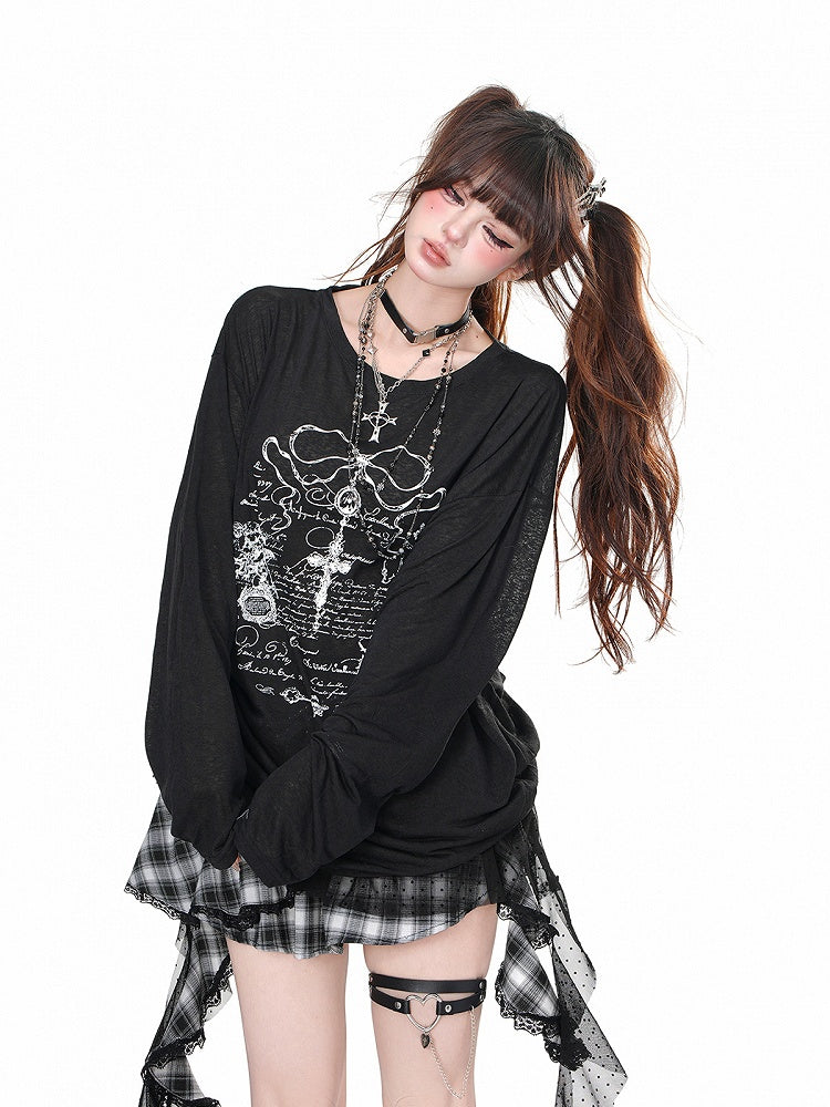 Schwarz/weißes, halbtransparentes, lockeres Sweatshirt mit Kreuzdruck und Kordelzug in der Taille