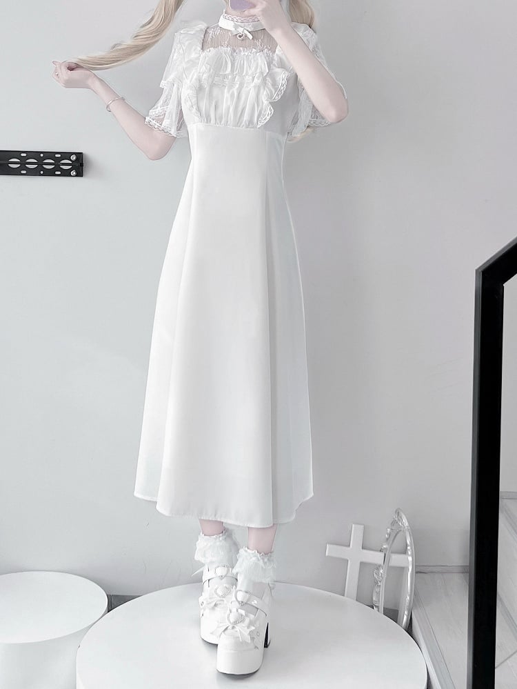 Jirai Kei – Kleid mit Illusionsausschnitt in Schwarz/Weiß mit gerüschtem Spitzenbesatz und hoher Taille