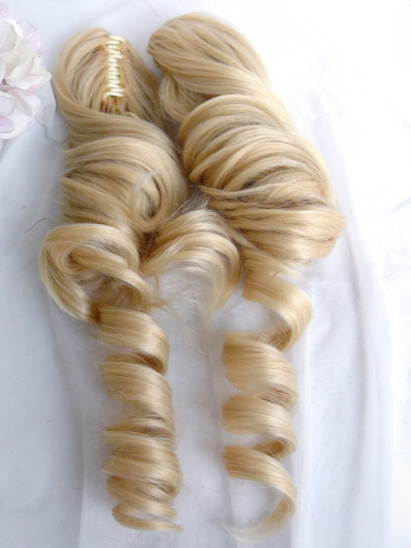 Blonde Perücke im kurzen Bobschnitt mit Pony und doppelten, lockigen Pferdeschwanzklammern
