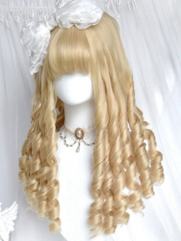Blonde, lockige Perücke in Unterbrustlänge mit vollem Pony