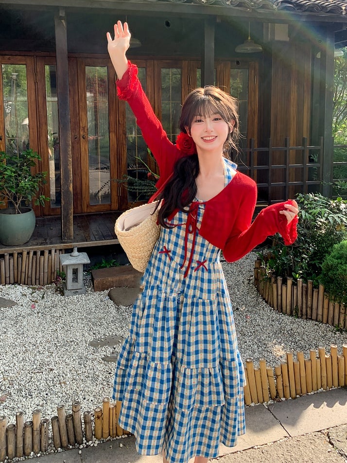 Süßes blaues, kariertes Neckholder-Ferienkleid mit Blumenmuster