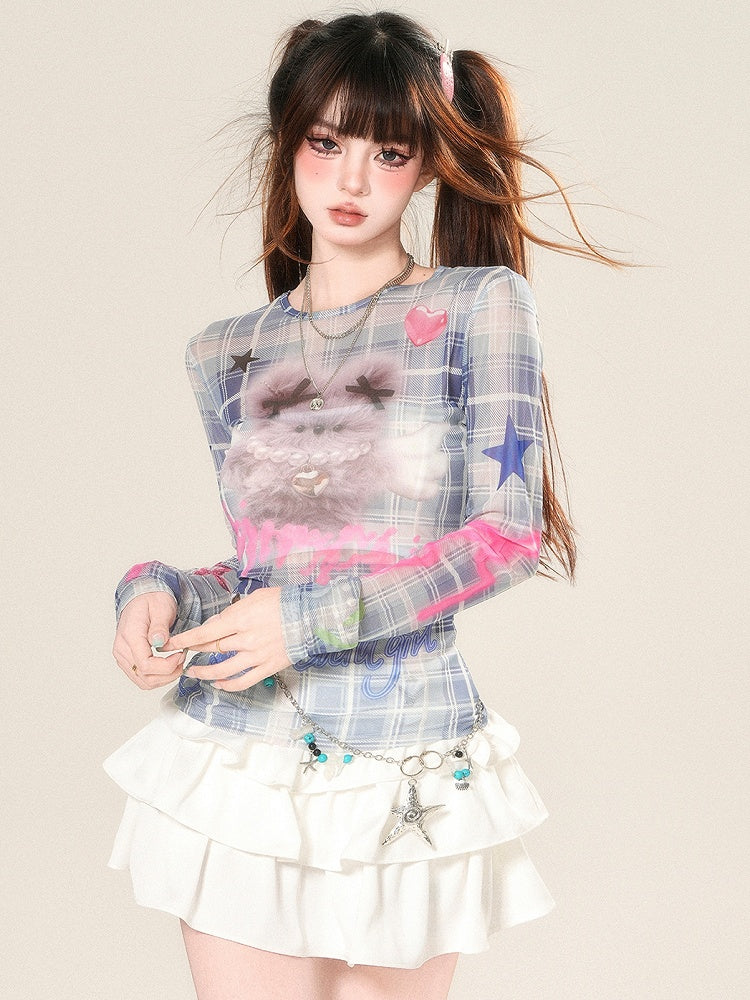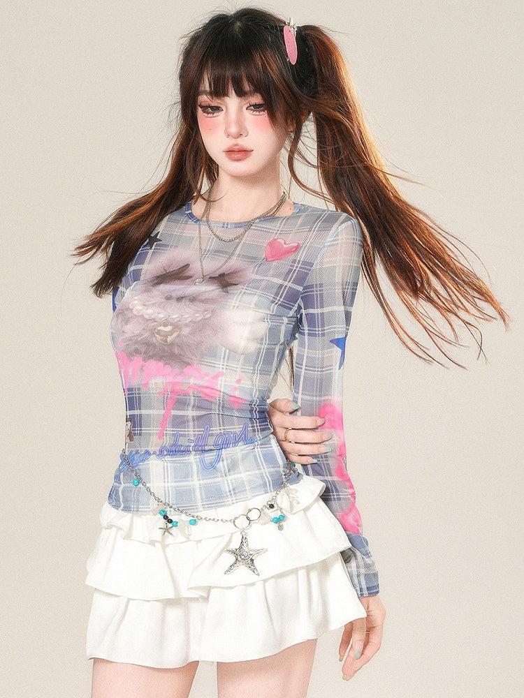 Blaues und glamouröses Top mit Druckmuster, langen Ärmeln, Buchstaben-Plaid-Puppe
