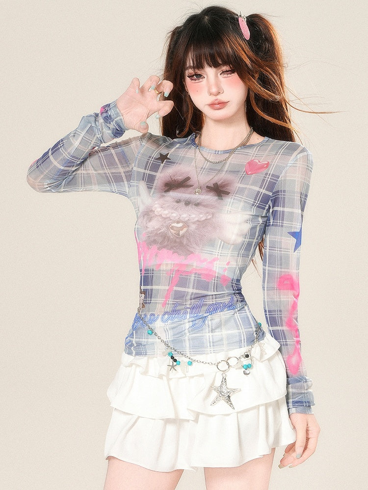 Blaues, langärmliges Oberteil mit Glamorous-Puppen- und Buchstabendruck und Karomuster