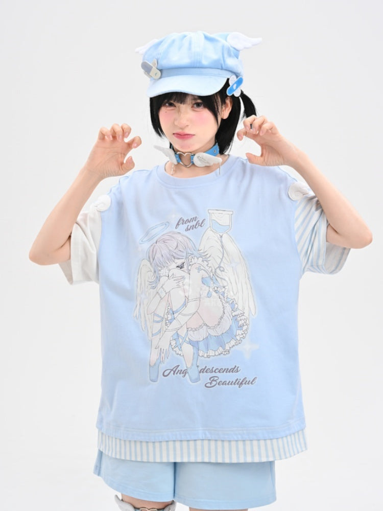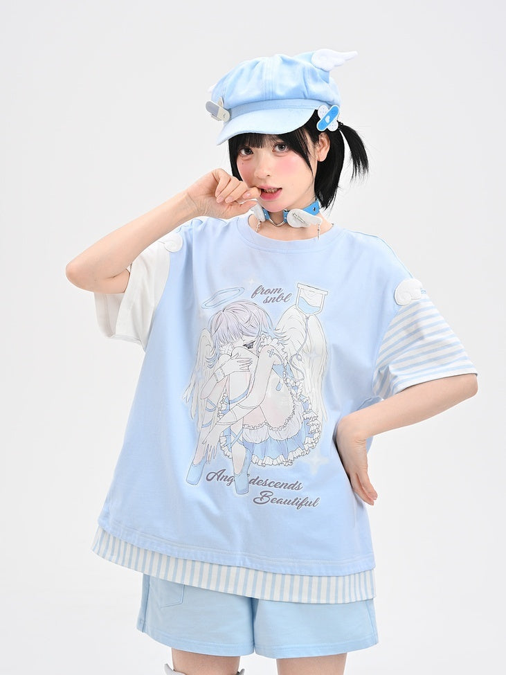 Blaues T-Shirt mit Flügel-Applikationen und Anime-Mädchen-Print und gestreiftem Schal