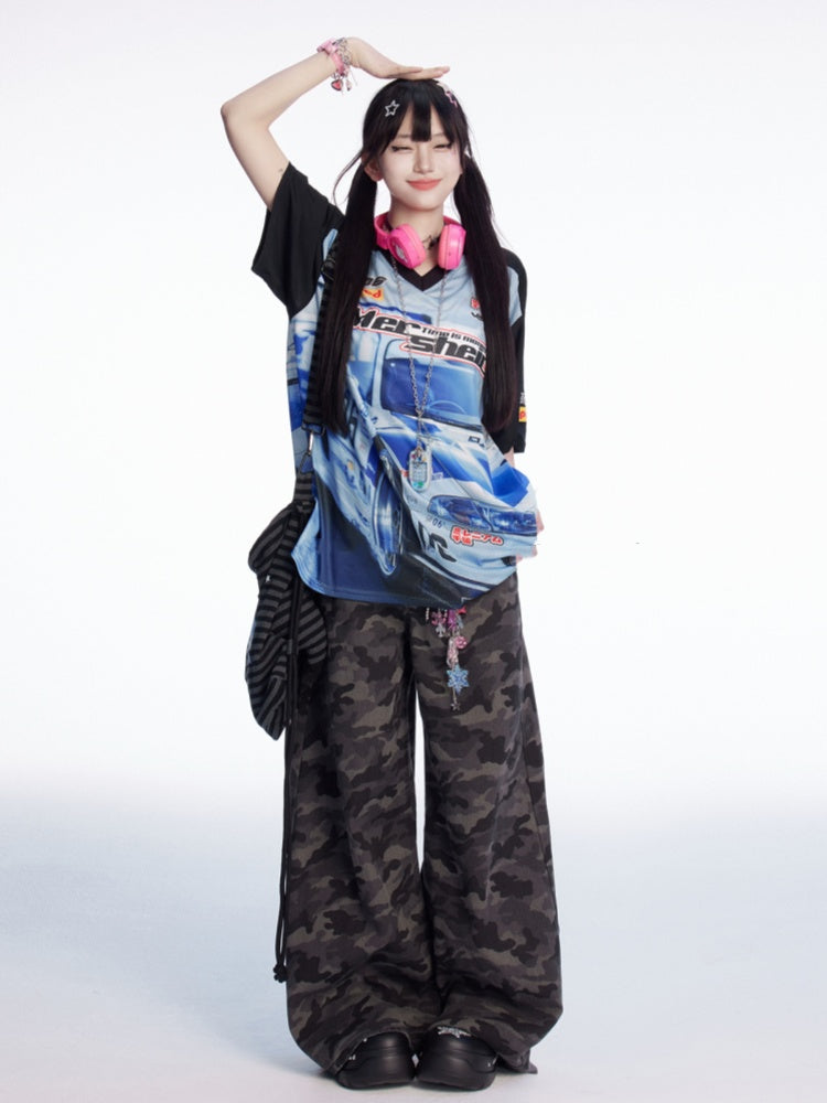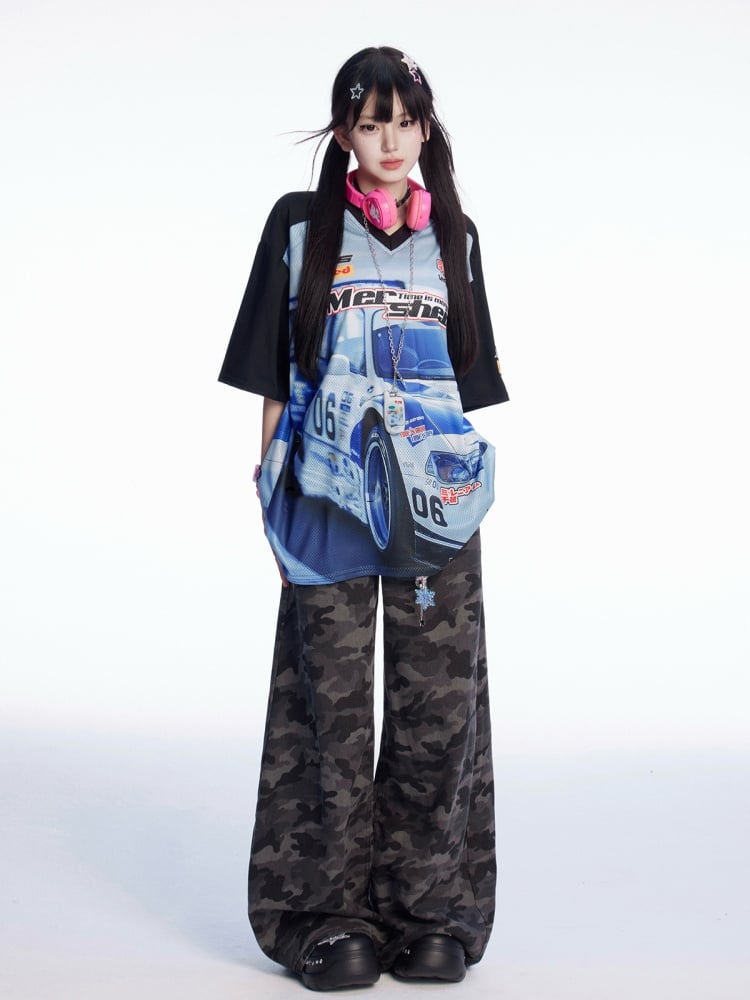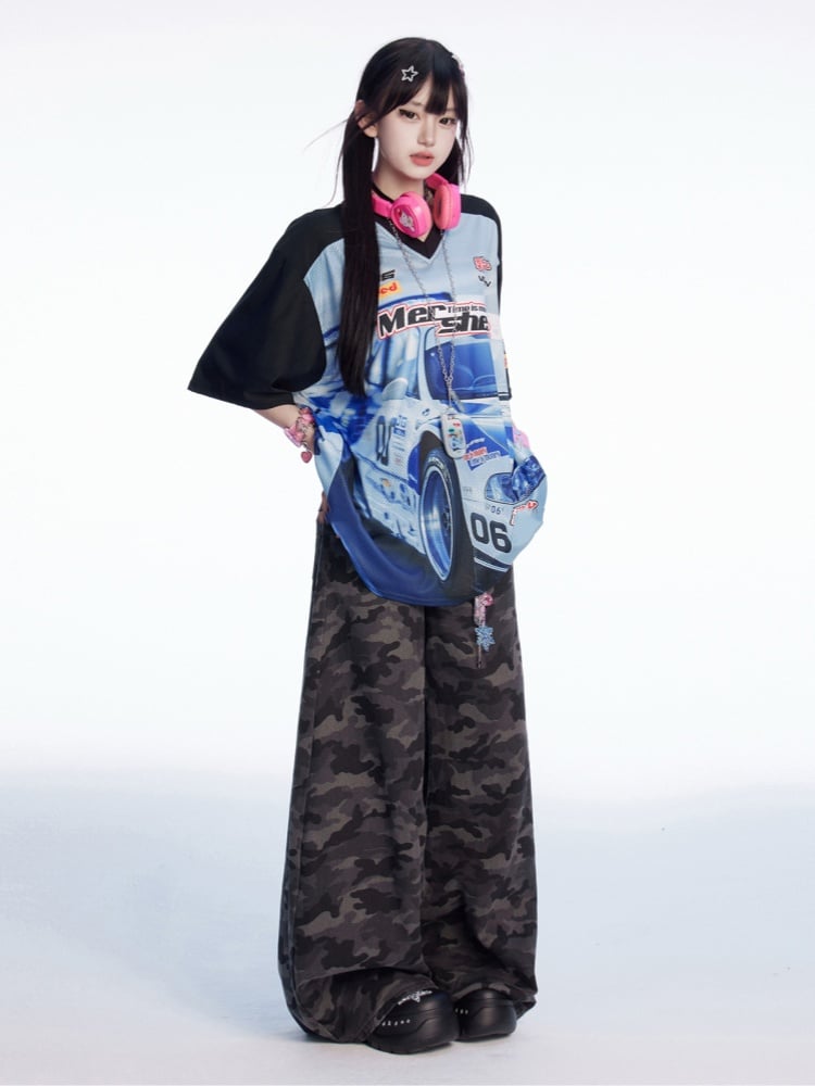 Lockeres T-Shirt mit V-Ausschnitt und Racing-Print im Colorblock-Design in Schwarz und Blau