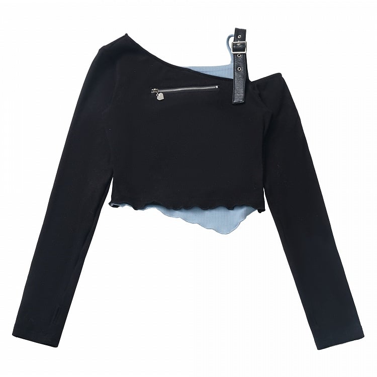 Dieses Oberteil bietet einen schmeichelhaften asymmetrischen Ausschnitt und einen eleganten Zweiteiler-Look in Blau und Schwarz. Perfekt für ein stilvolles und dennoch lässiges Outfit.