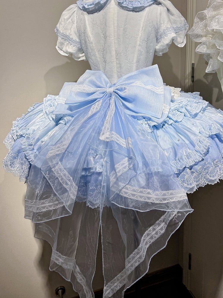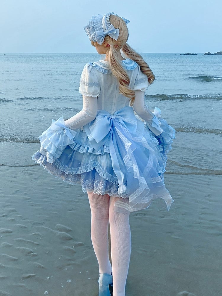 Blau-weißes Old School Lolita Fashion Kleid mit Schleife und Details, JSK-Set