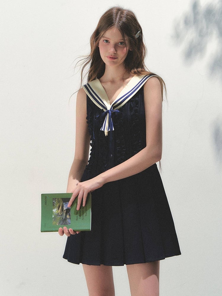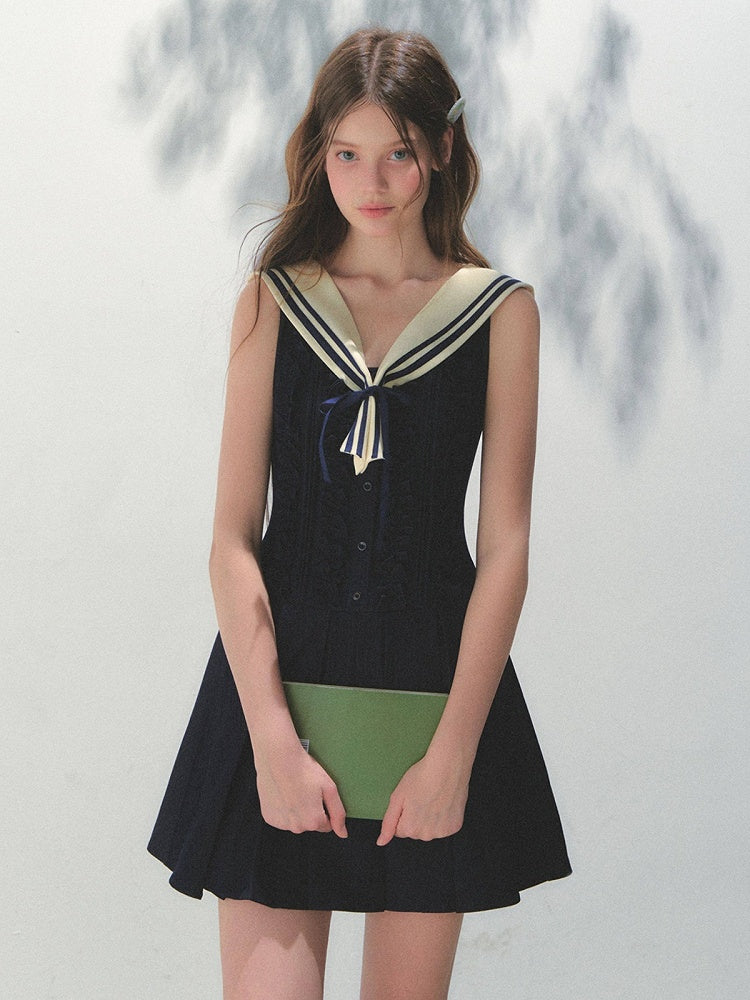 Navy Blue Kawaii Style Pleated Dress with Detachable Sailor Collar