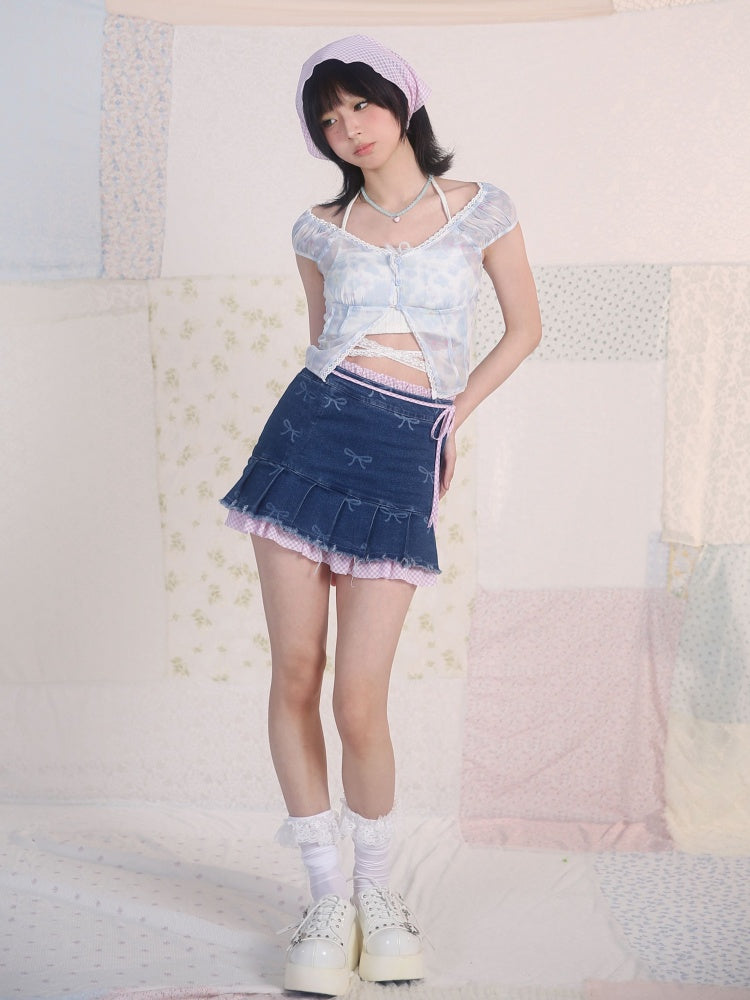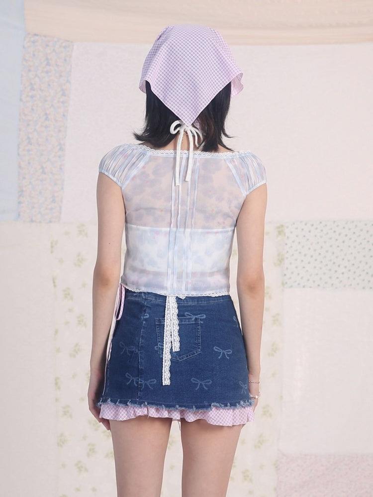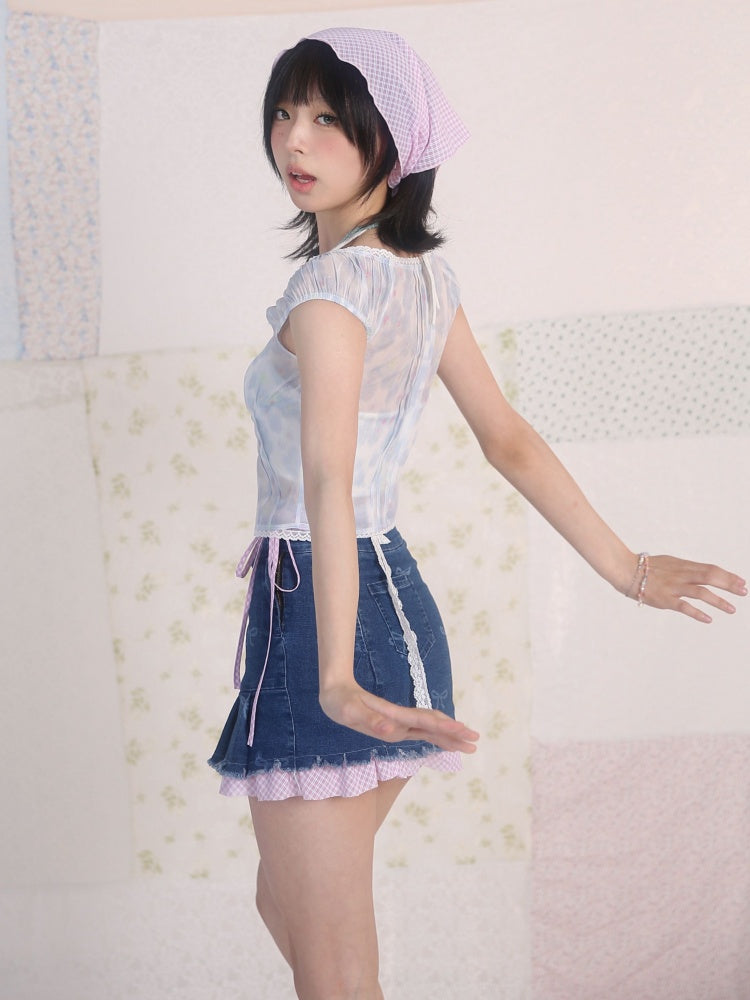 Blaues Top mit V-Ausschnitt und floralem Spitzenbesatz