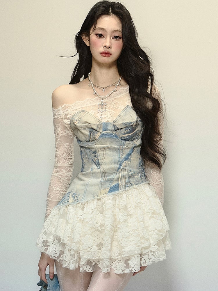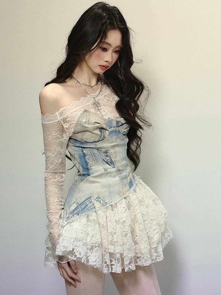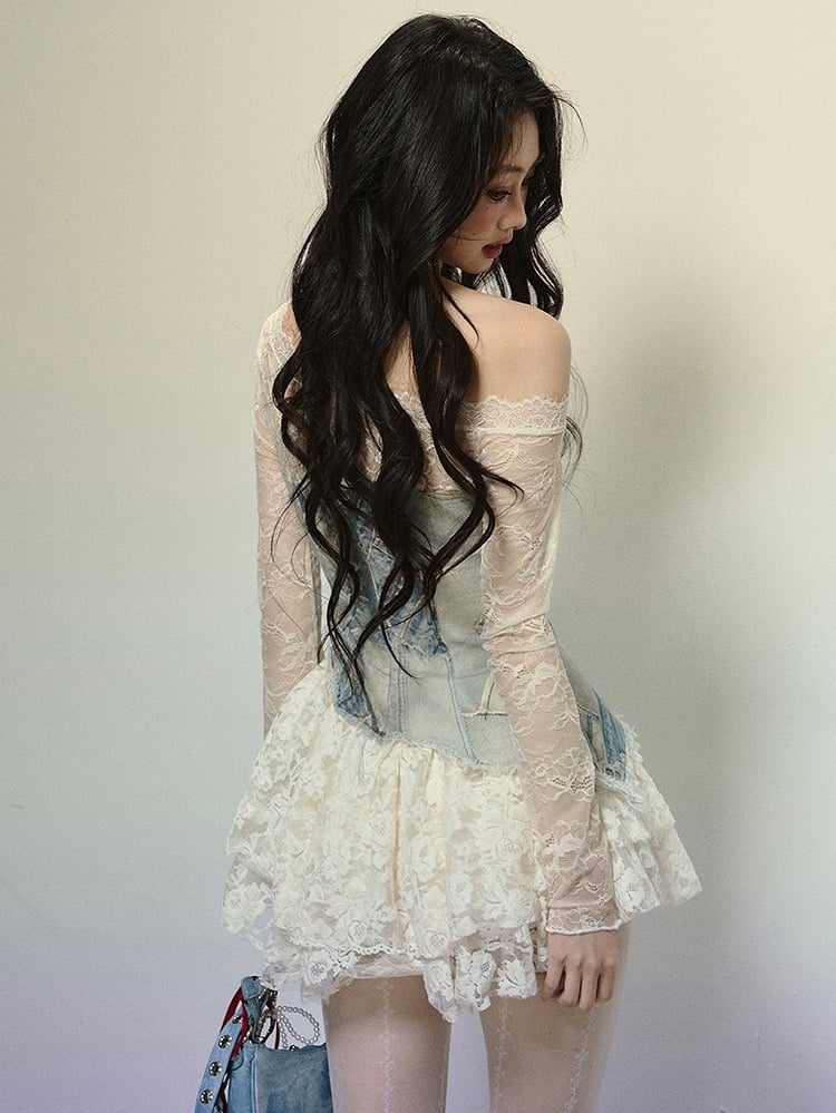 Blaues Minikleid aus Denim mit Patchwork-Spitze und asymmetrischem Ausschnitt