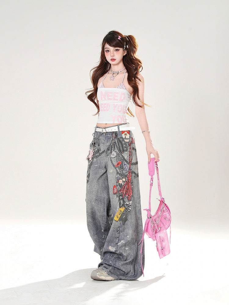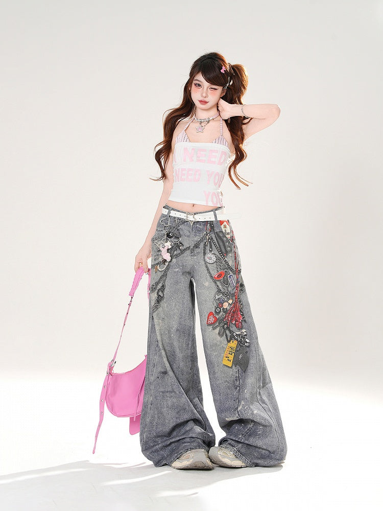 Blaue Jeans mit weitem Bein und niedrigem Aufdruck, Taillen-Sprühfarbenketten
