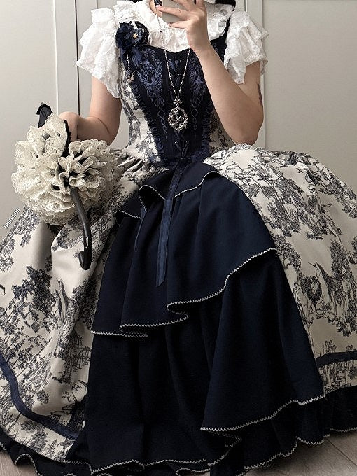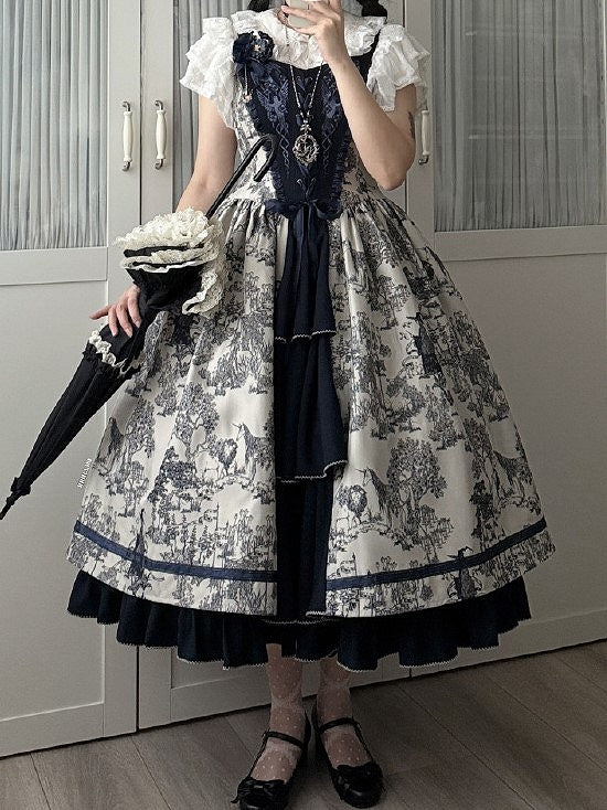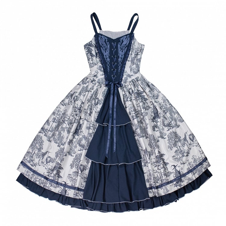 Dark Blue Corset Bodice Elegant Lolita Dress with Forest and Animals Print