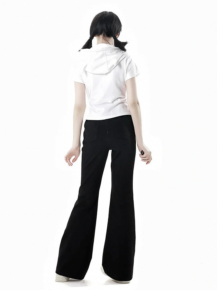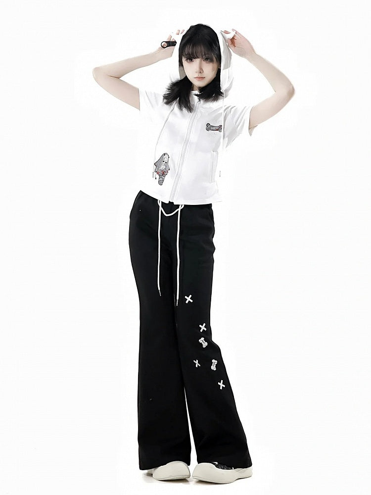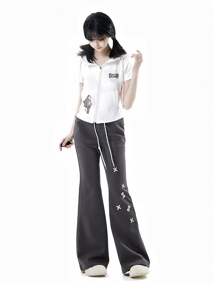 Schwarz/Blau/Graue Schlaghose mit Knochenstickerei und Kordelzug in der Taille