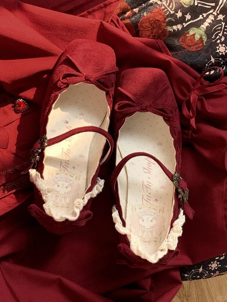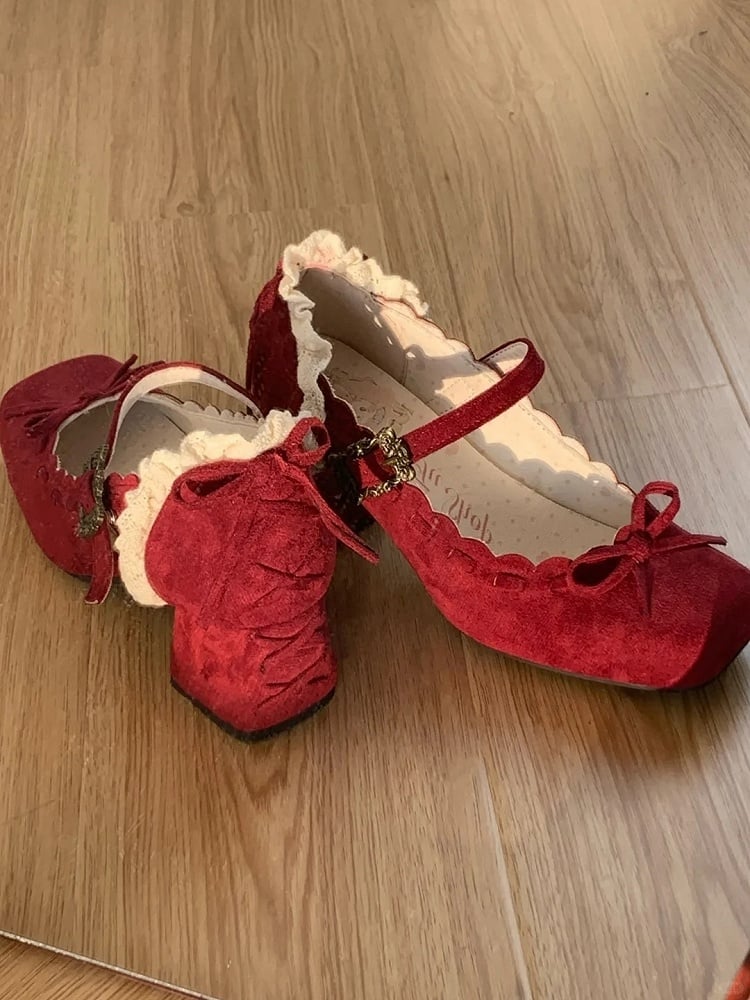 Decorative Bow, Heel Lace-up Detail & Scalloped Hem Square Toe Red Elegant Mid-heel Mary Janes