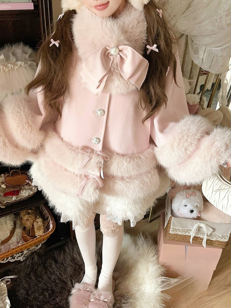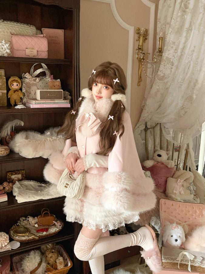 Rosafarbener Fleece-Umhang mit Kunstpelzbesatz und Schleifenverzierungen