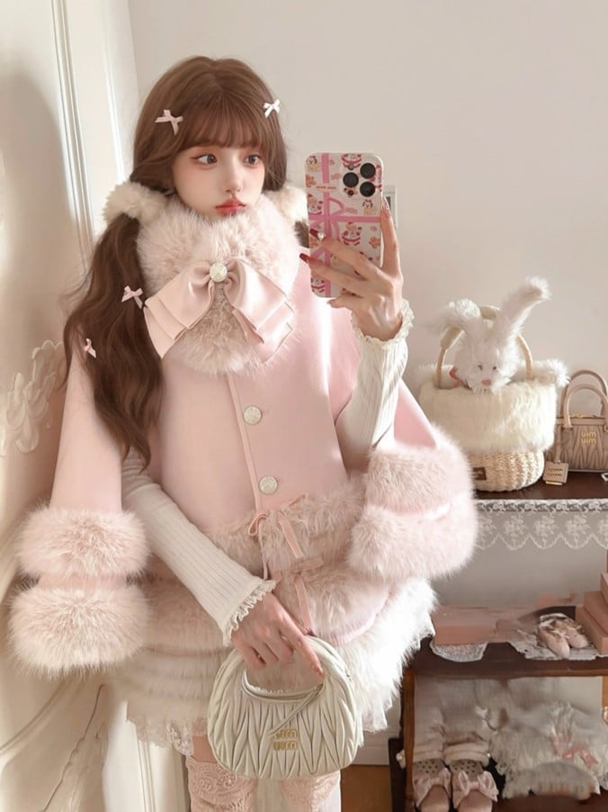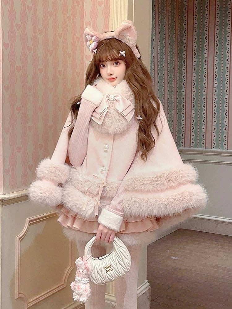 Rosa Fleece-Umhang mit Schleifenpelzbesatz und Akzenten