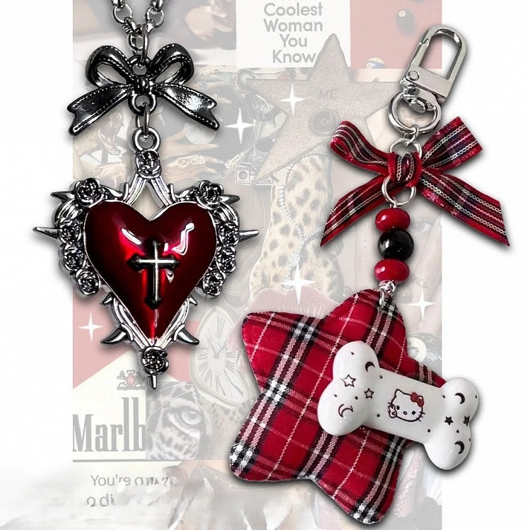 Y2K Burgunderroter Schleifen Schlüsselanhänger/Rotes Kreuz Herz Halskette