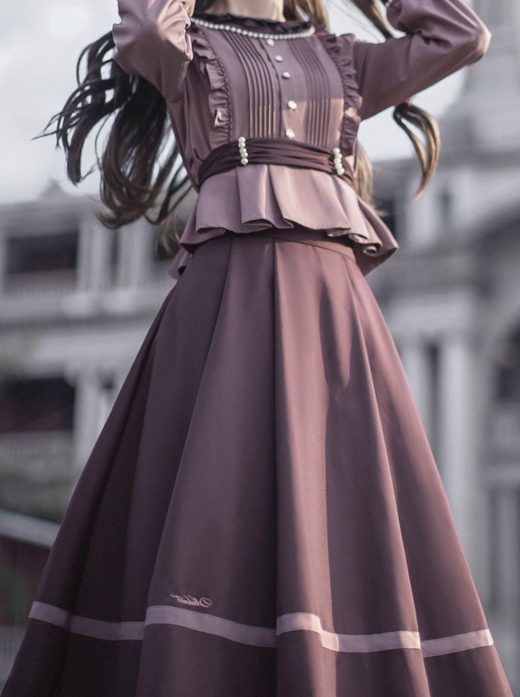 Dieses bezaubernde lila Outfit besteht aus einem Oberteil im Retro-Stil und einem ausgestellten Rock mit gesmoktem Bund für eine elegante und bequeme Passform. Die große Schleife verleiht dem Outfit eine süße und verspielte Note. Perfekt für jeden Anlass.