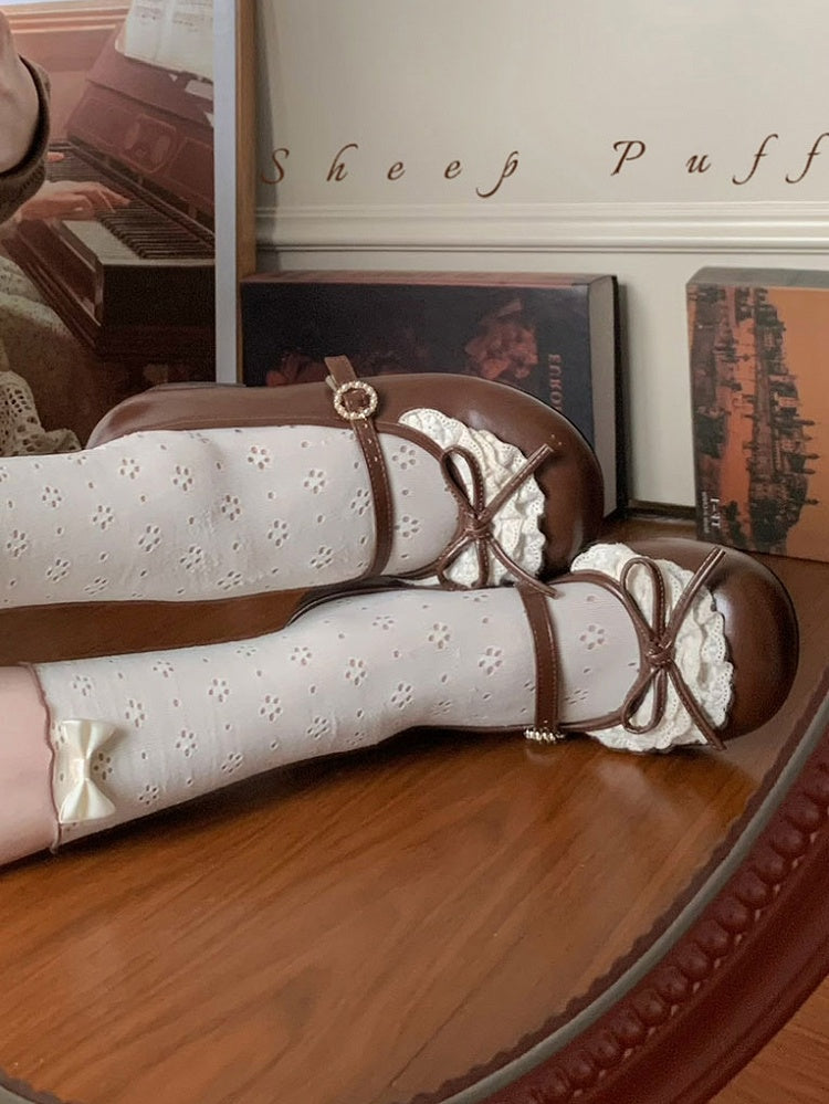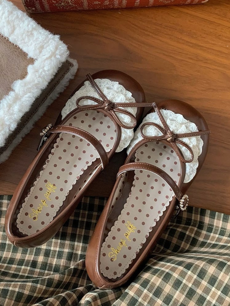 Dunkelbraune Mary Janes mit geknoteter Schleife und Spitzenbesatz, 2,2 cm Absatz, runde Zehenpartie