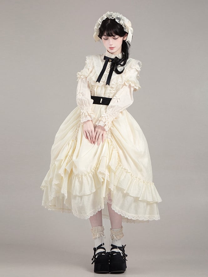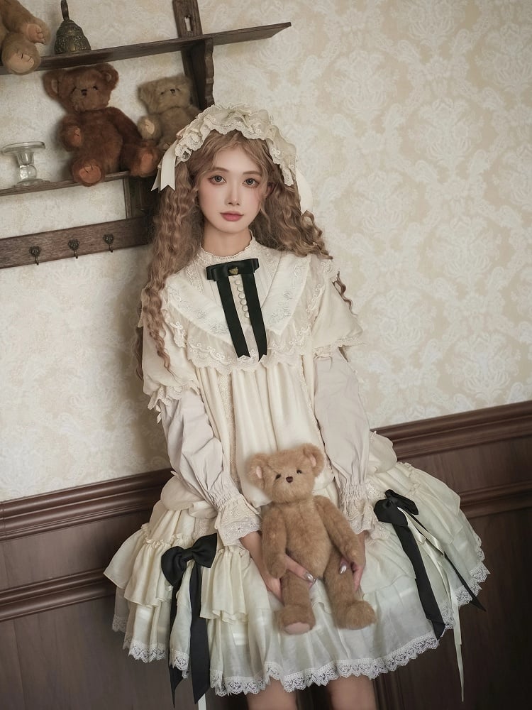 Beiges Lolita Fashion Kordelzug-Design Vielseitiges Kleid mit schwarzem Taillengürtel und Schleifen
