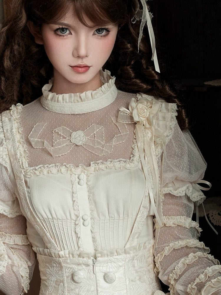 Blau-weißes Old School Lolita Fashion Kleid mit Schleife und Details, JSK-Set