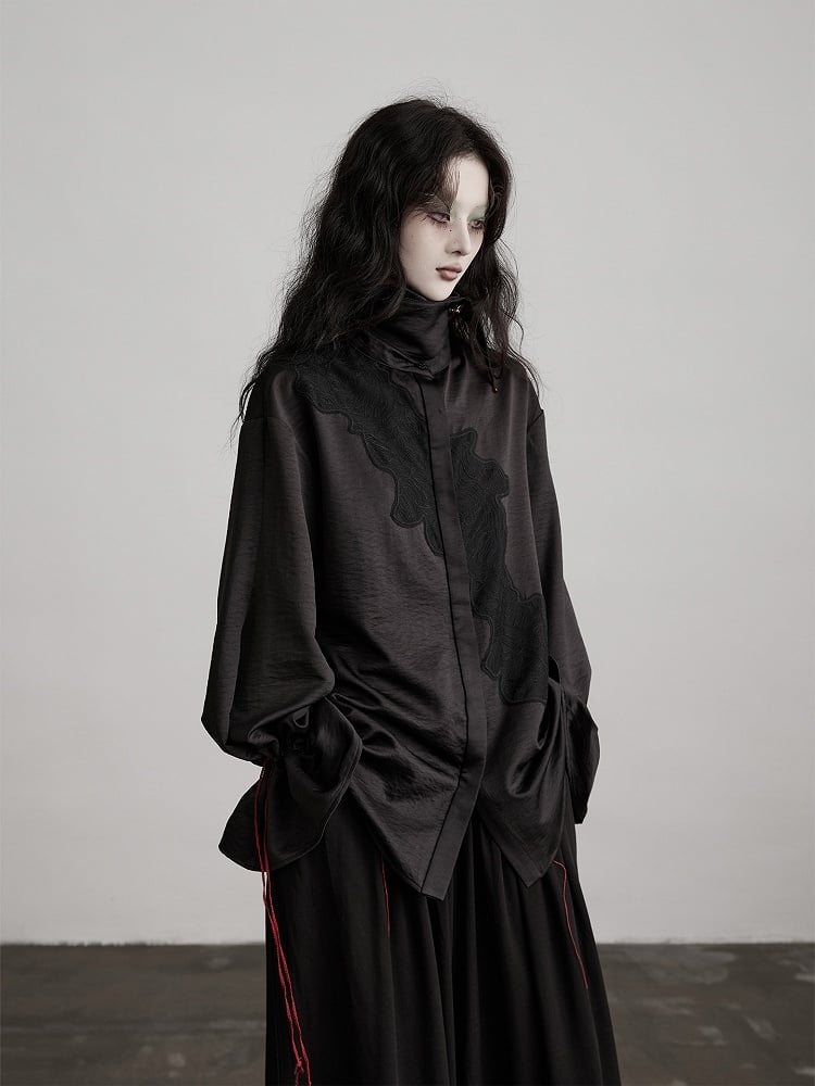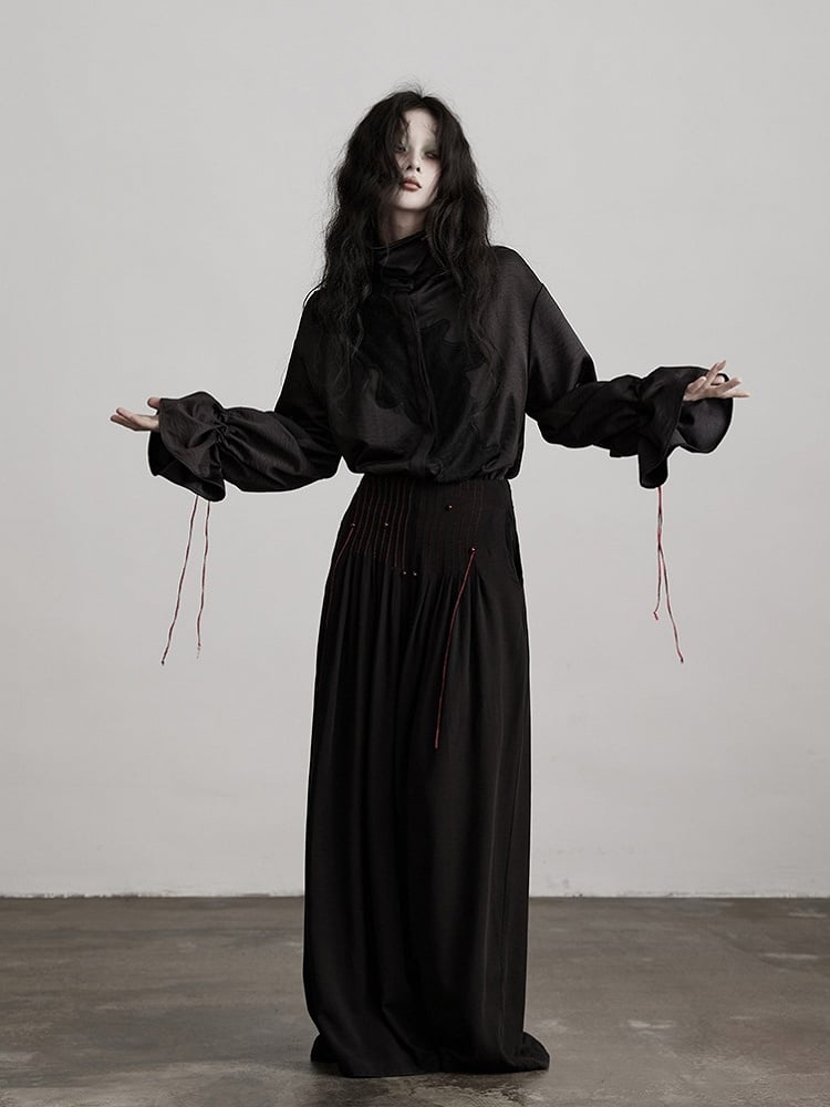 Urban Goth Black Subtle Pattern Drawstring Shirt with Red Button Brooch Decoration