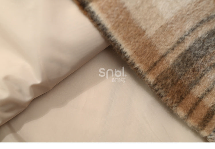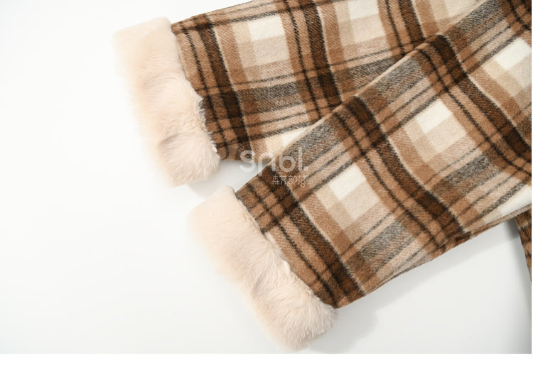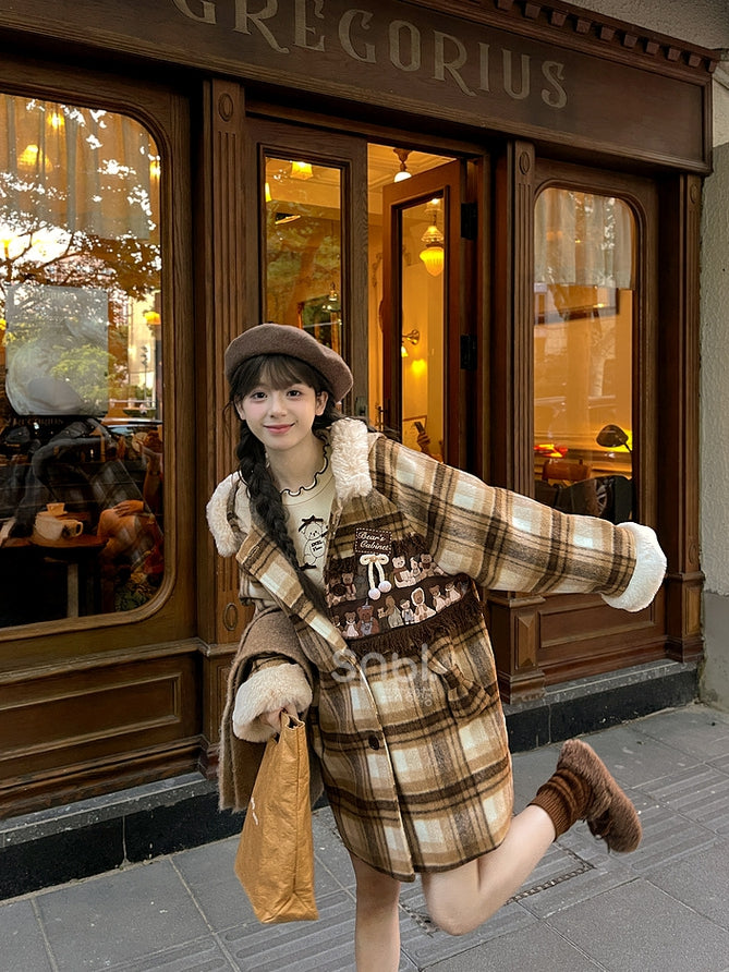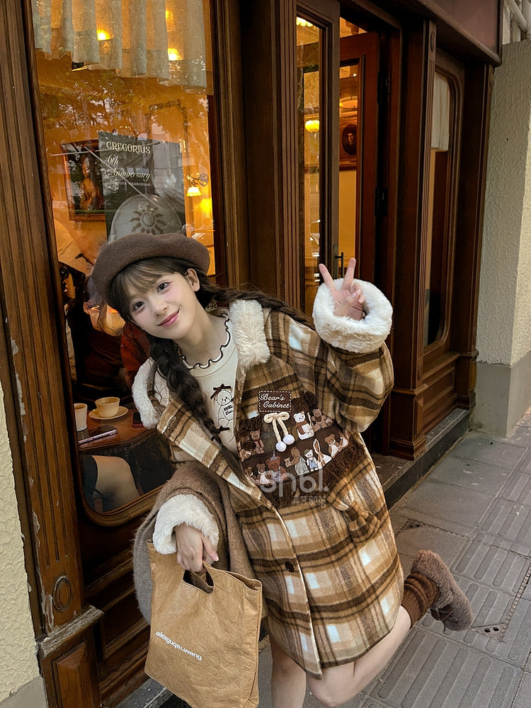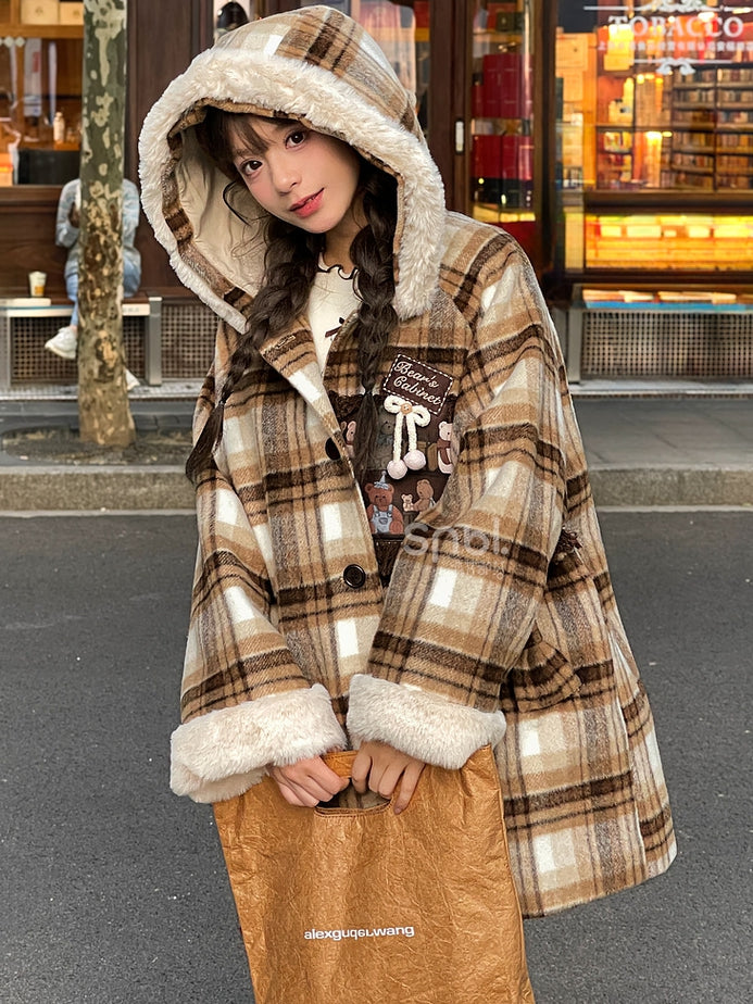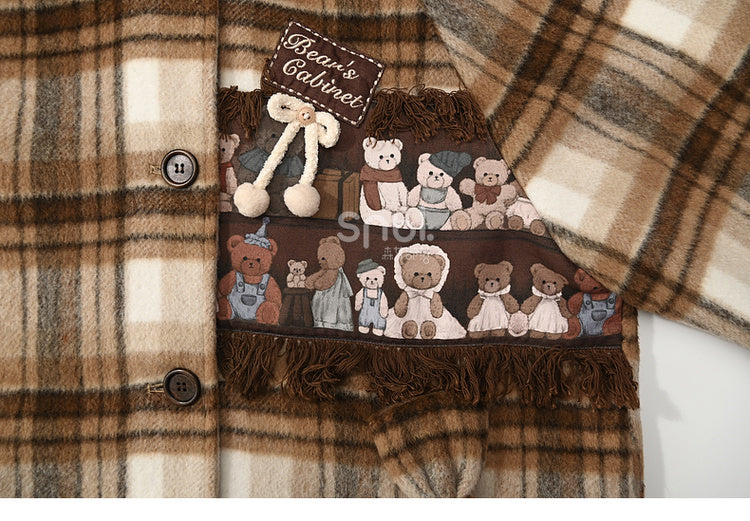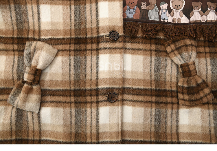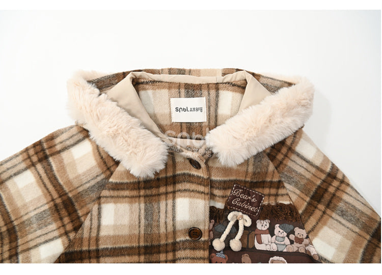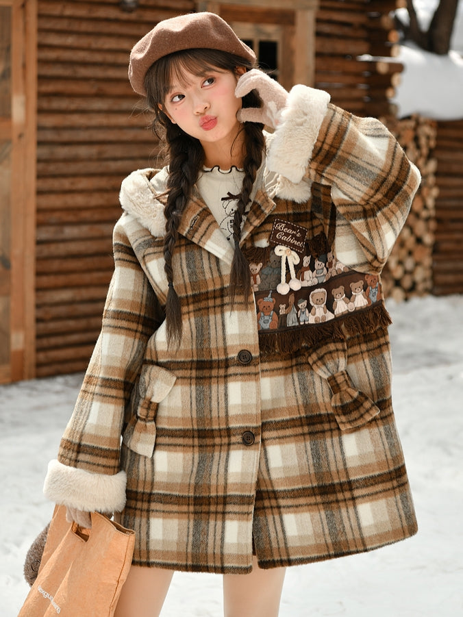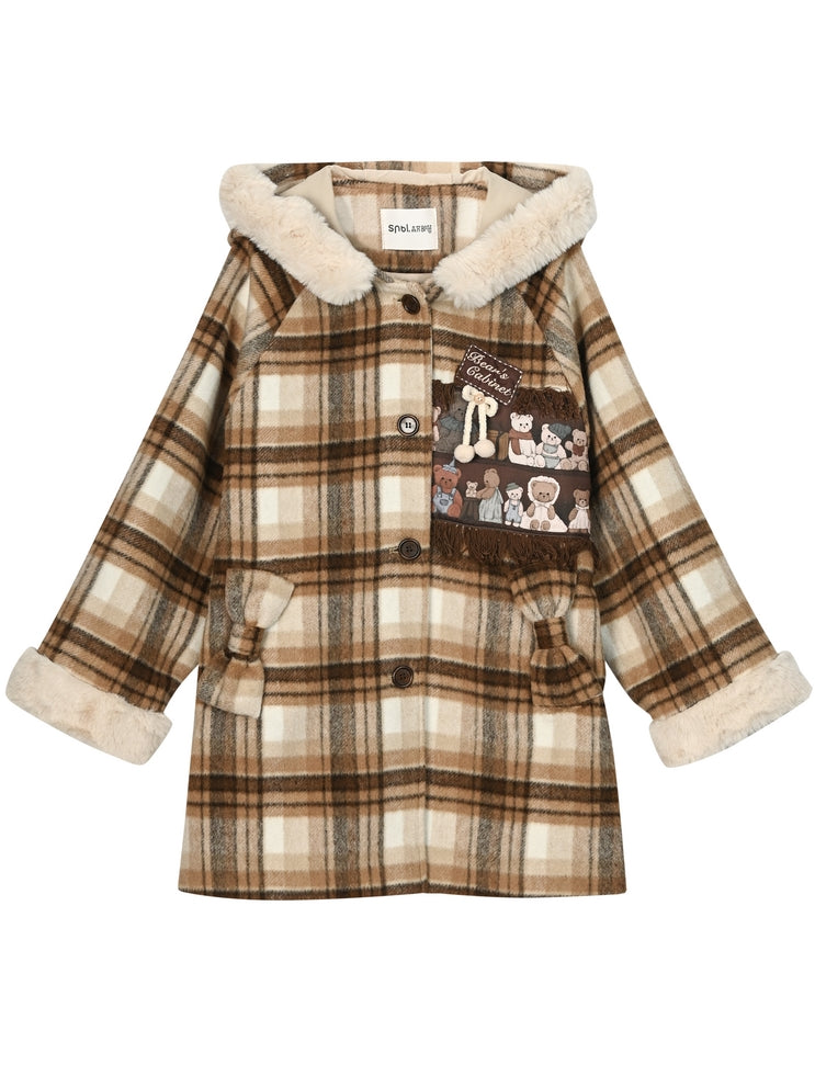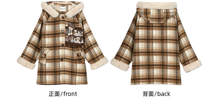 Brauner Wollmantel mit süßer Bären-Applikation und karierter Kapuze, lange Version