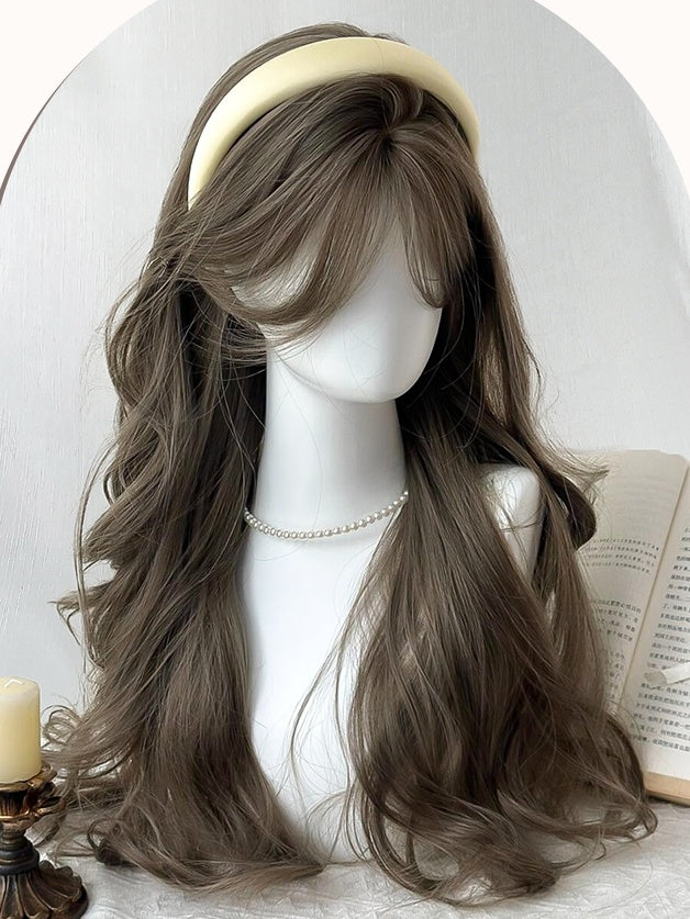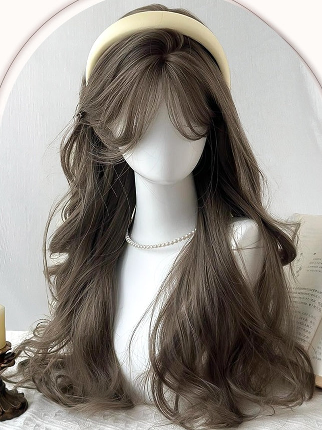 Braune lange gewellte Kunsthaarperücke mit Vorhangpony