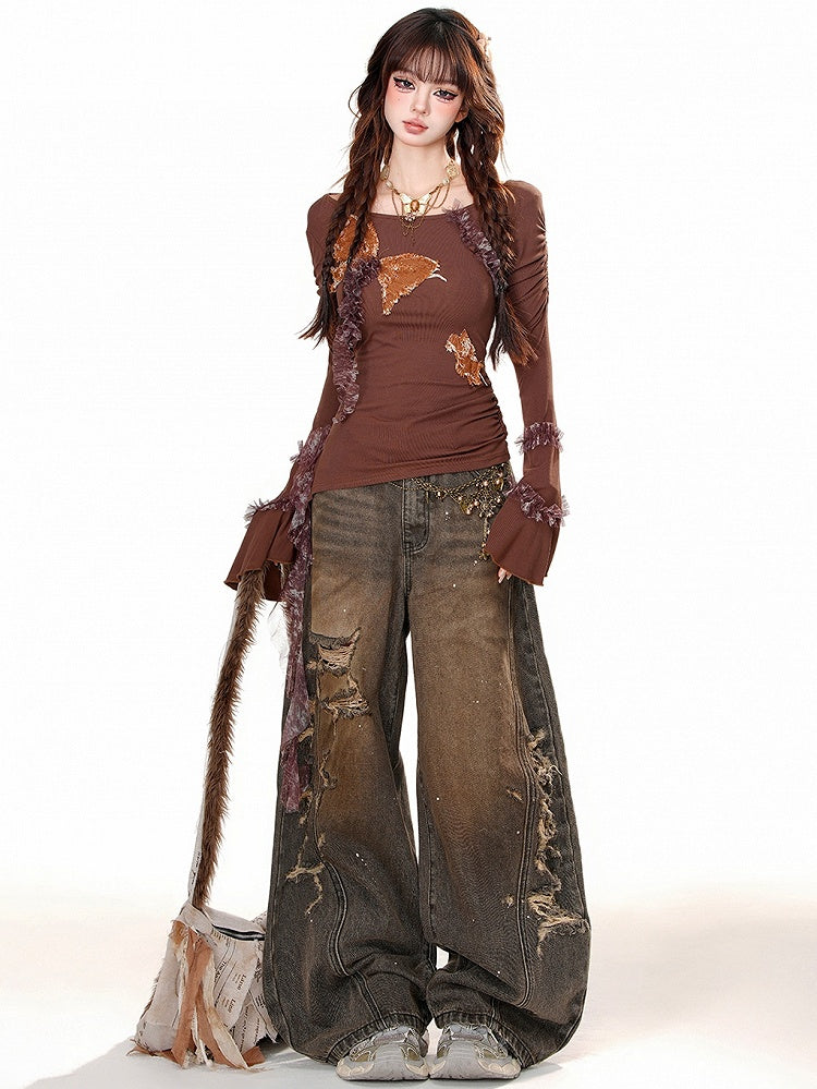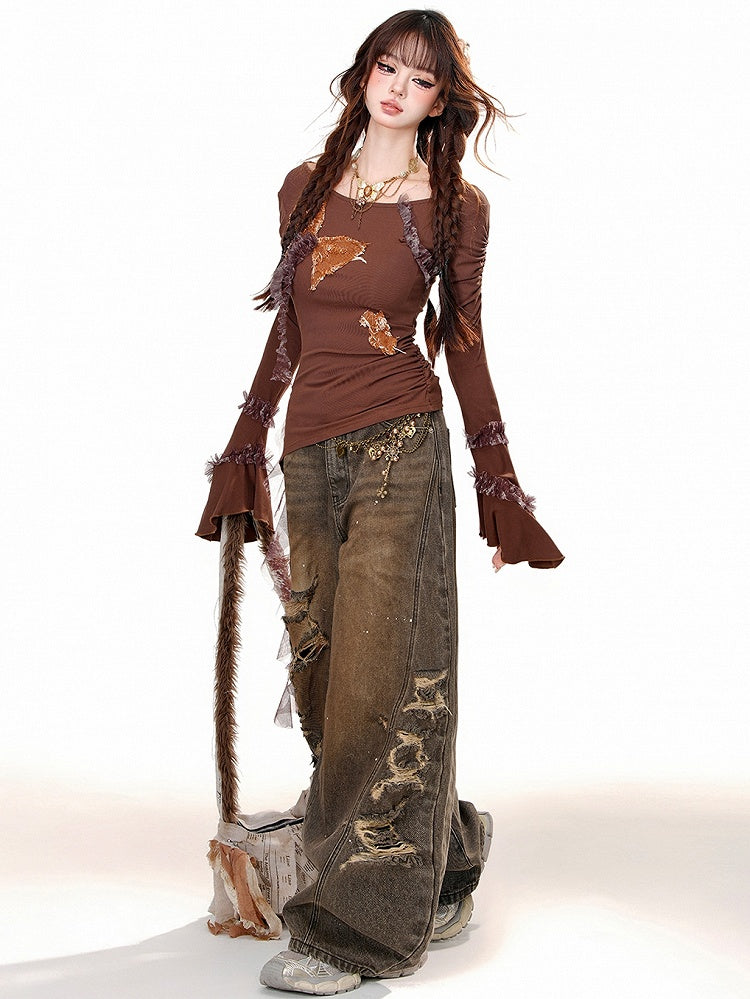 Braunes Mesh-Top mit Rüschendetail, geraffter Taille und Glockenärmeln