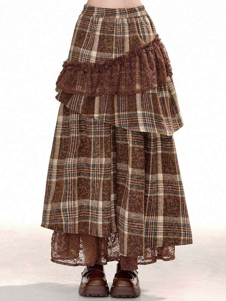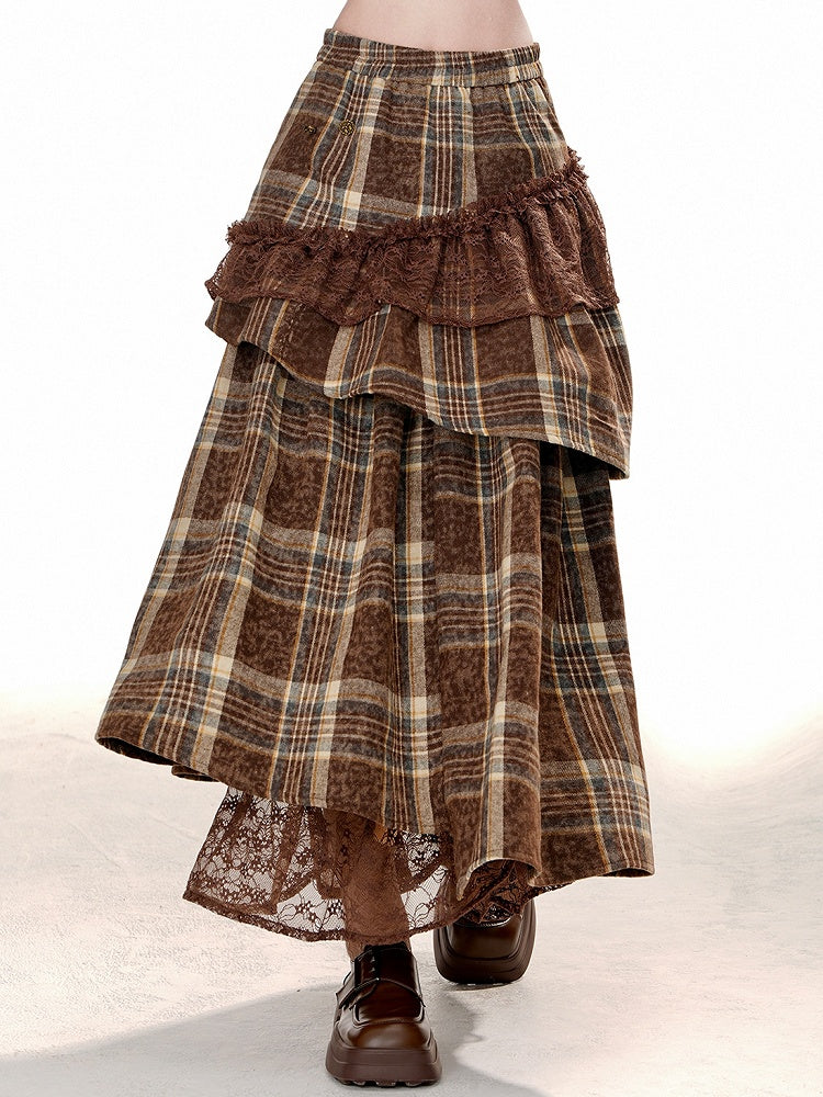 Dieser bezaubernde braunkarierte Patchwork-Spitzenrock mit geraffter Taille verfügt über eine verstellbare Taille und zarte Spitzendetails. Perfekt für einen süßen und charmanten Look.