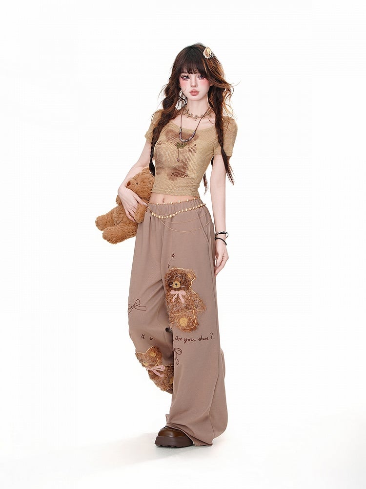 Gönnen Sie sich Niedlichkeit mit unserer braunen Plüsch-Teddybär-Hose. Aus weichem Material gefertigt und mit bezaubernden Schleifendetails verziert, bietet diese lockere Hose mit weitem Bein die perfekte Mischung aus Komfort und Stil. Lassen Sie Ihr inneres Kind erstrahlen und haben Sie es den ganzen Tag gemütlich.