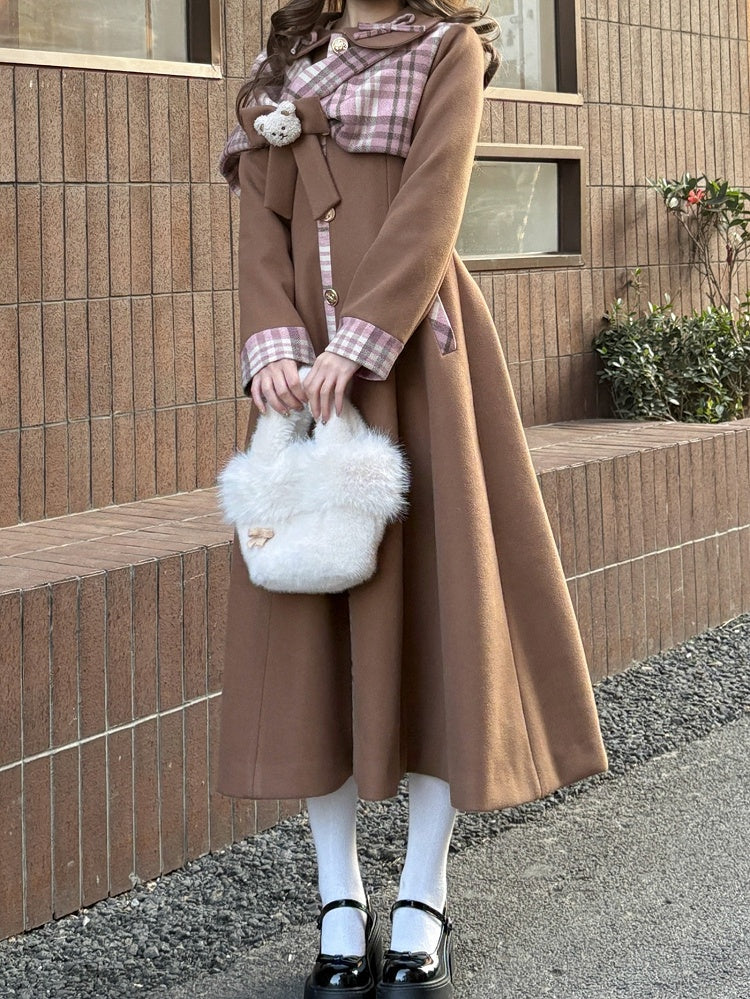 Bleiben Sie warm und stilvoll mit unserem braunen Sweet Vintage Preppy Style Mantel mit bezaubernder Schleife und weichen karierten Schaldetails. Perfekt für einen gemütlichen und süßen Look!