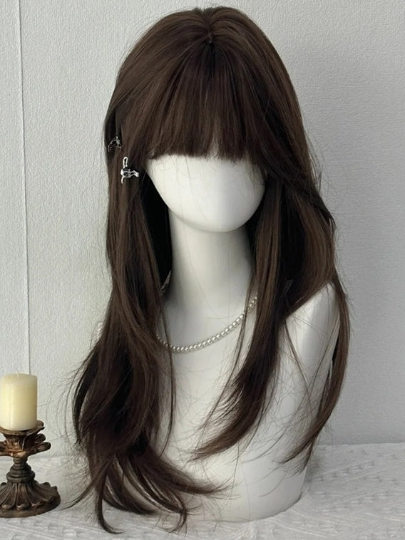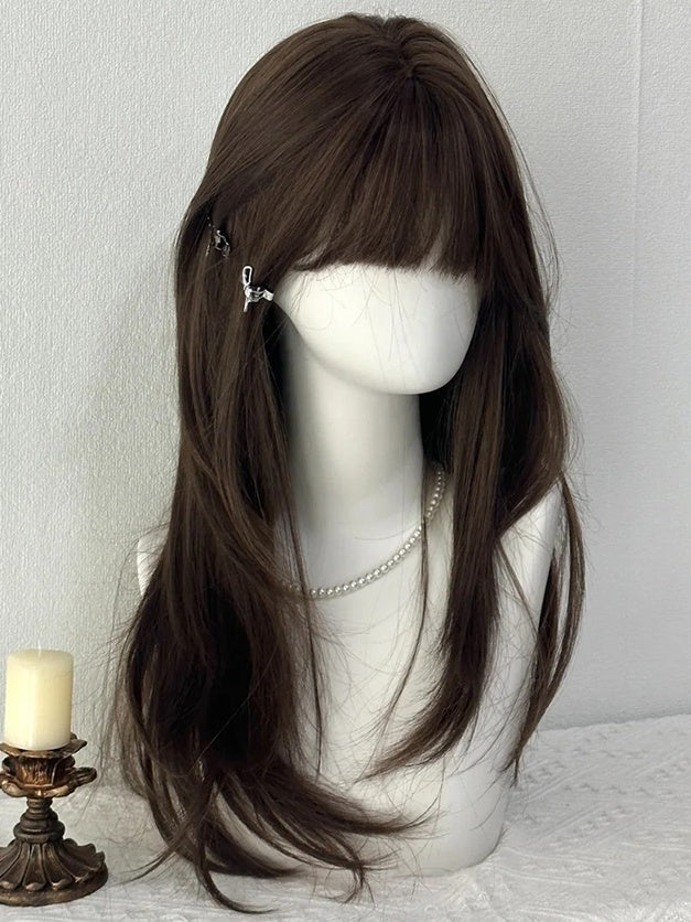Braune, glatte Kunsthaarperücke in Unterbrustlänge mit Pony