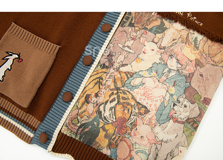 Braune Strickjacke mit Gänseblümchen- und Häschenstickerei
