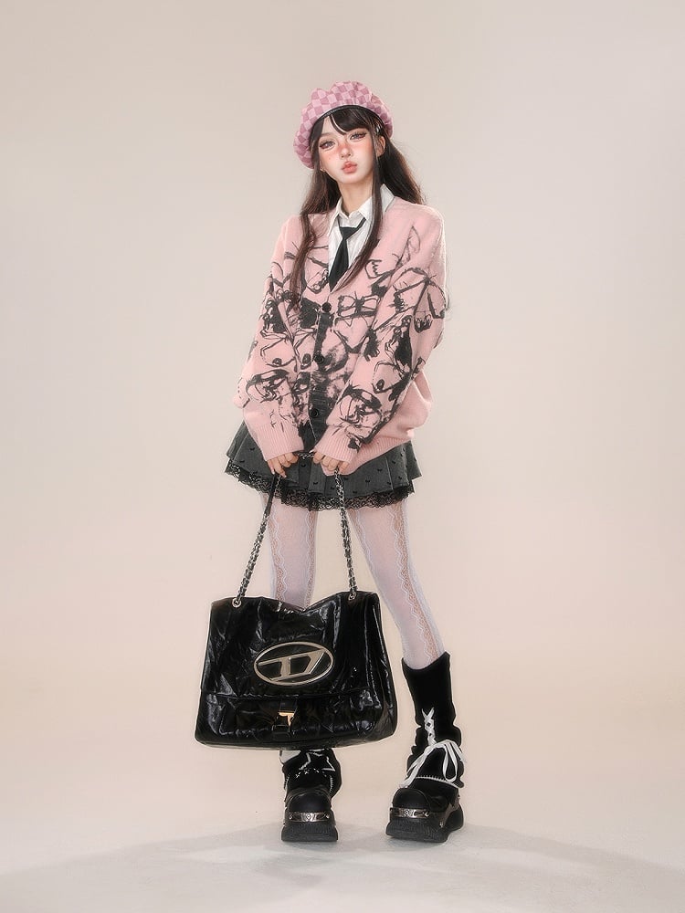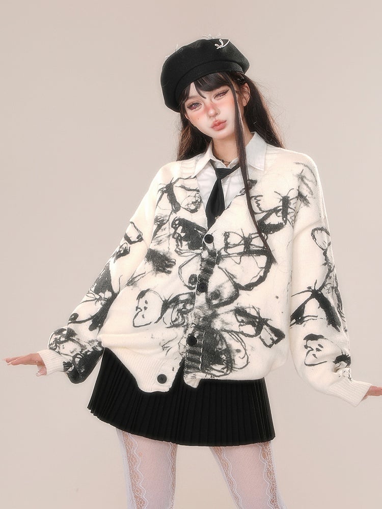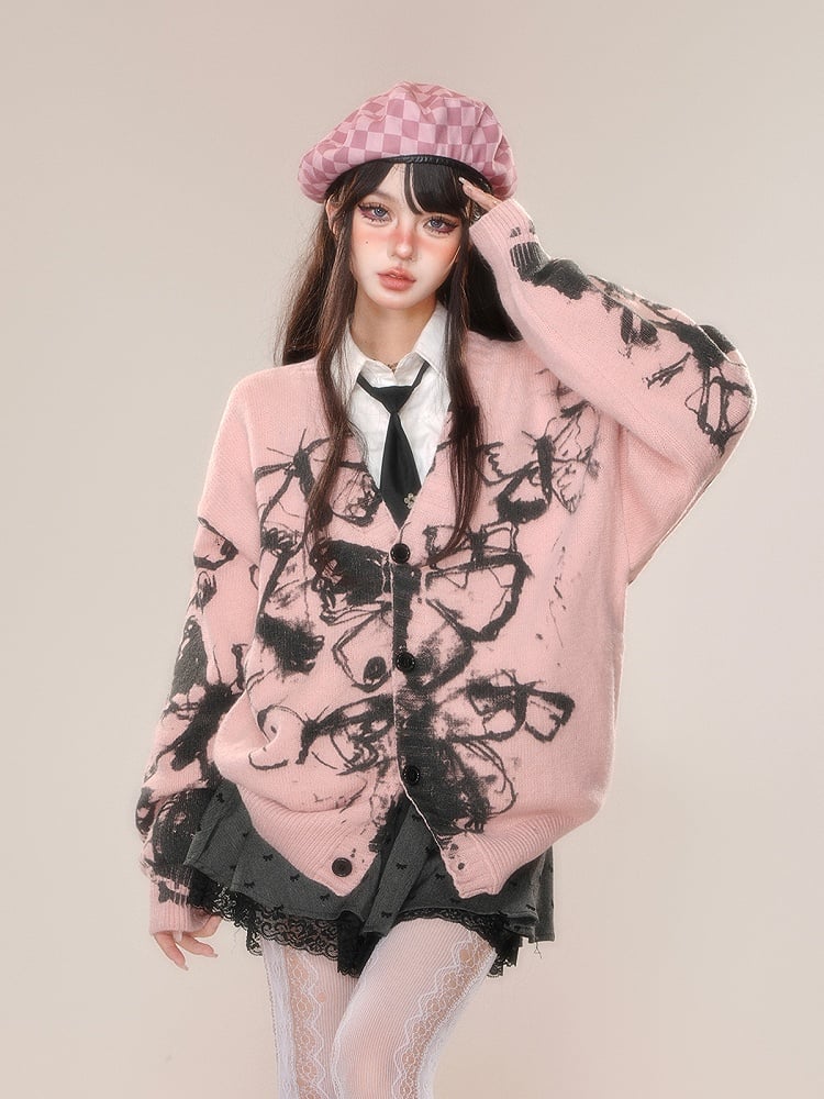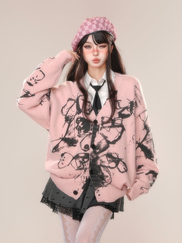 Cardigan mit V-Ausschnitt und Schmetterlings-Graffiti