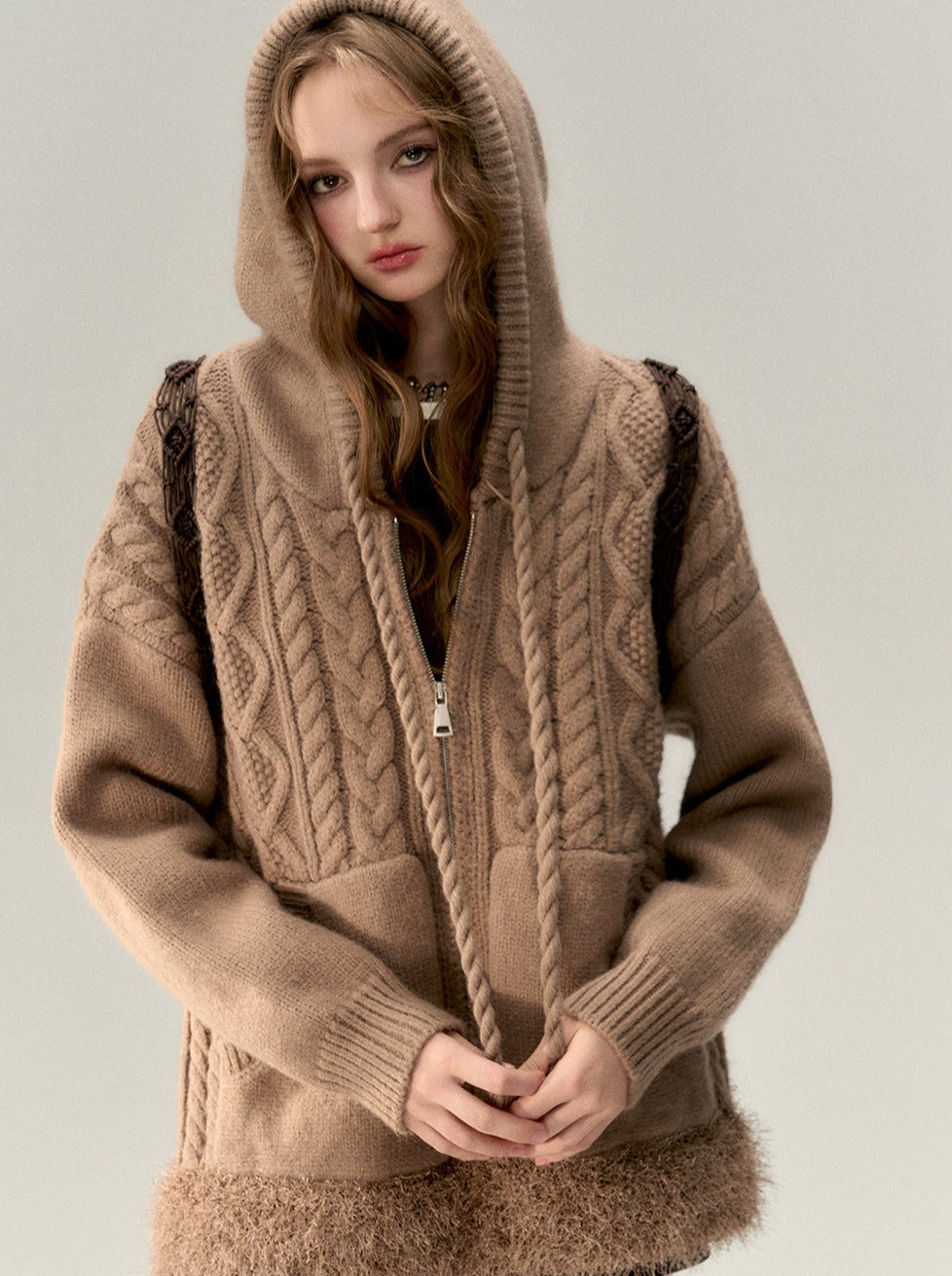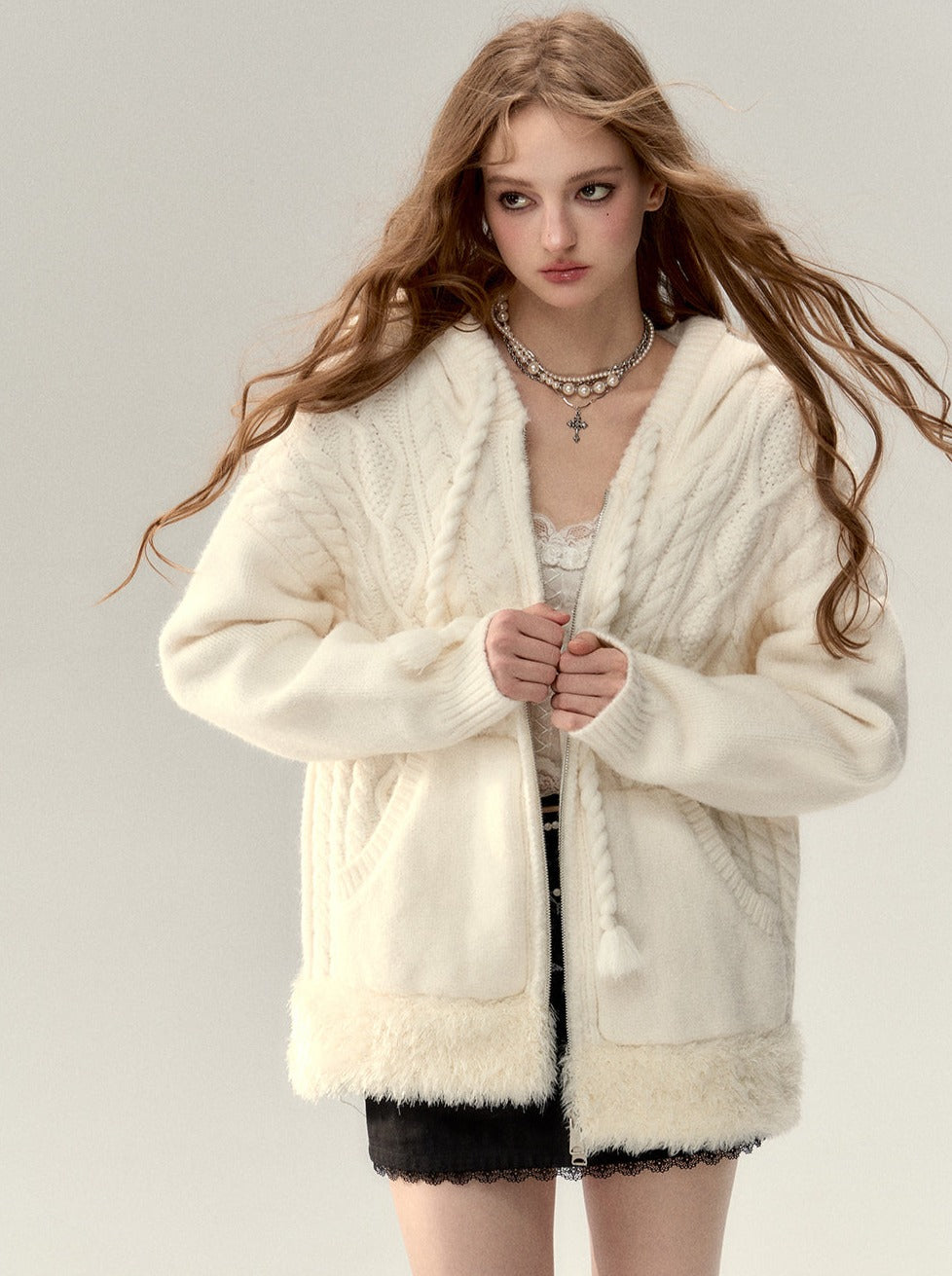 Fühlen Sie sich kuschelig und süß in unserem Cable Fur Zip-Up Knit Hoodie. Weicher Zopfmuster-Strick mit warmem Fellfutter hält Sie warm und sieht bezaubernd aus. Perfekt für kühle Tage und entspannte Wochenenden.