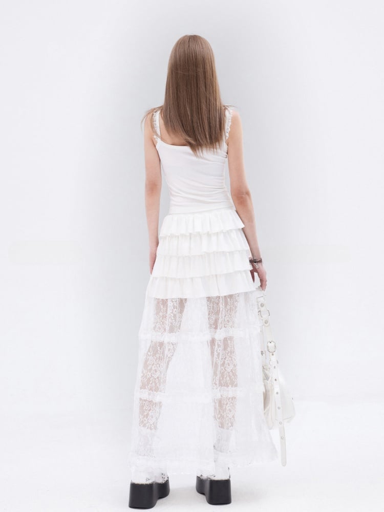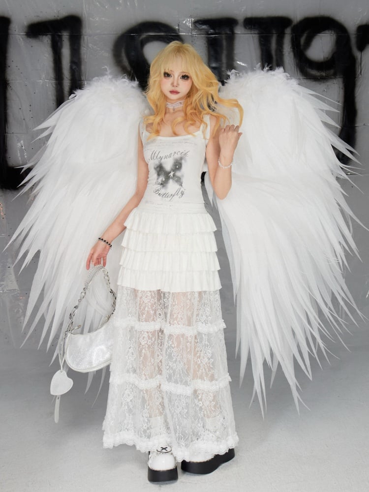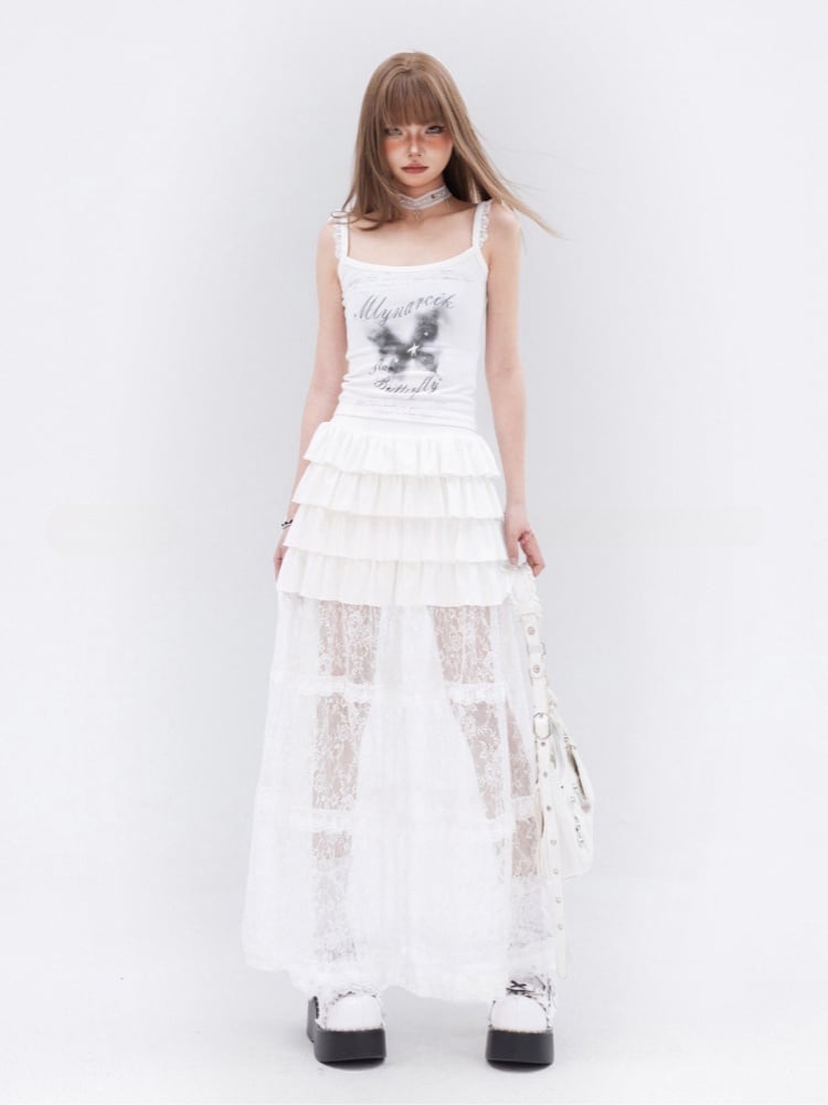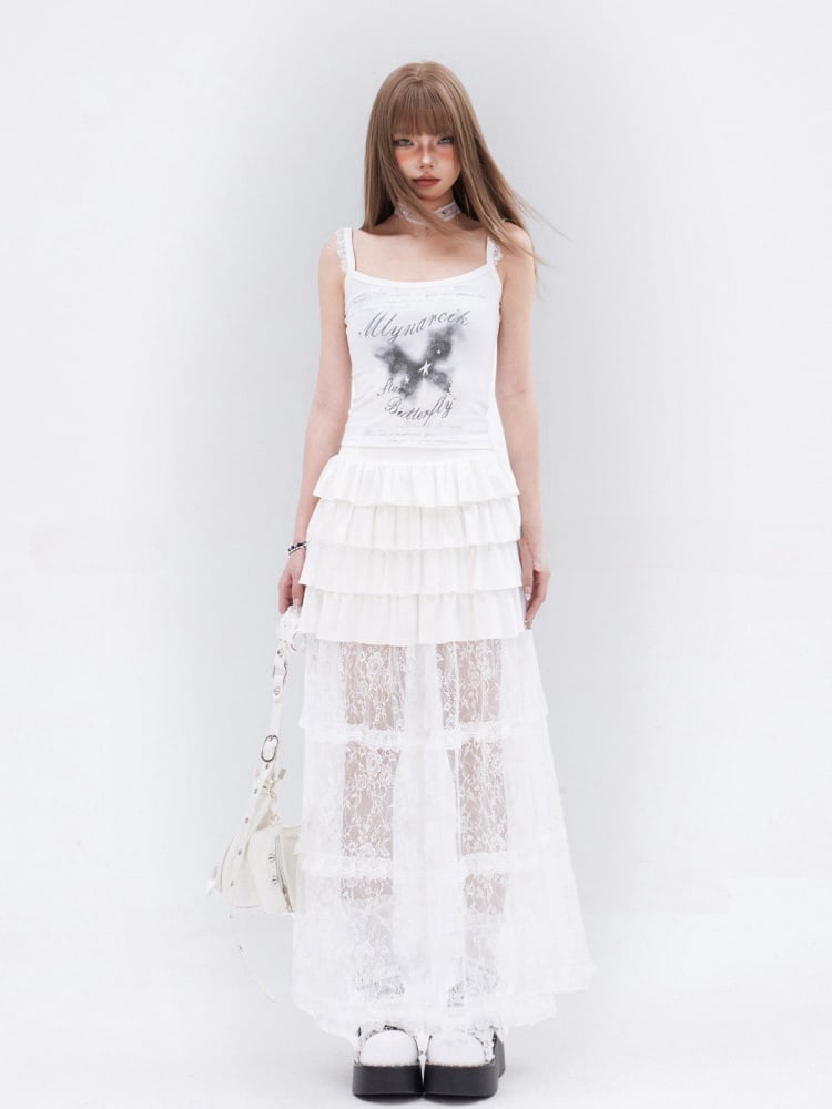 Glamouröses, schmal geschnittenes Cami-Top mit Spitzenbesatz und Schmetterlingsdruck in Weiß