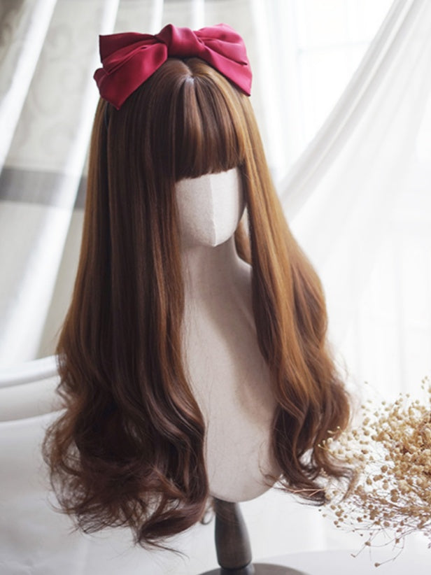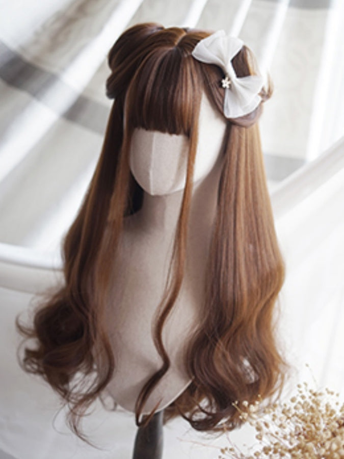 Karamellfarbene, lange, gewellte Perücke mit vollem Pony