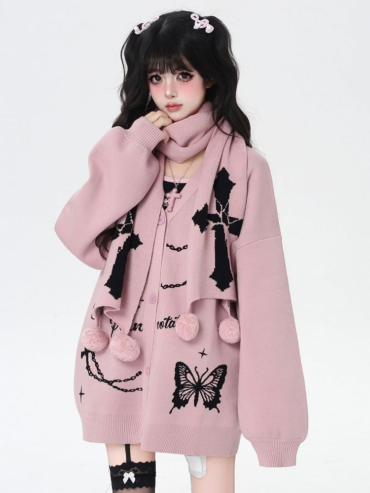Black/Pink Bittersweet Cardigan & Scarf Set - Cross & Butterfly Motifs with Pompon Charm Scarf