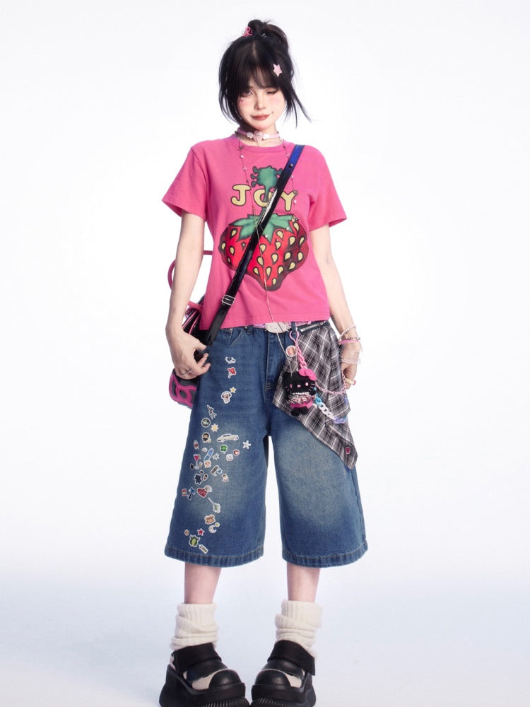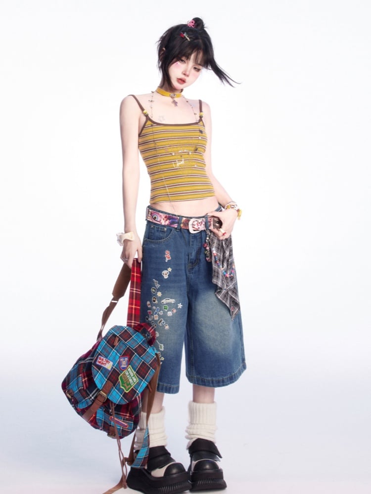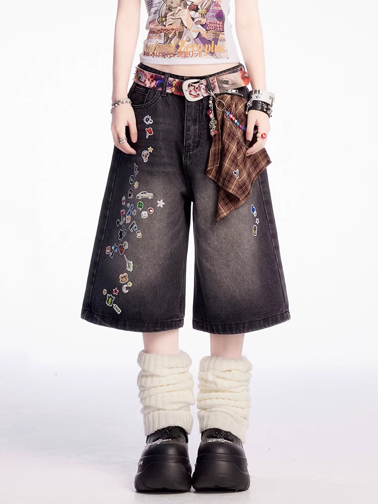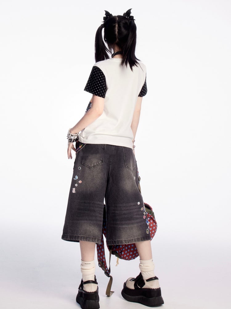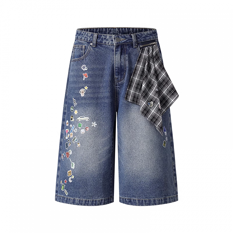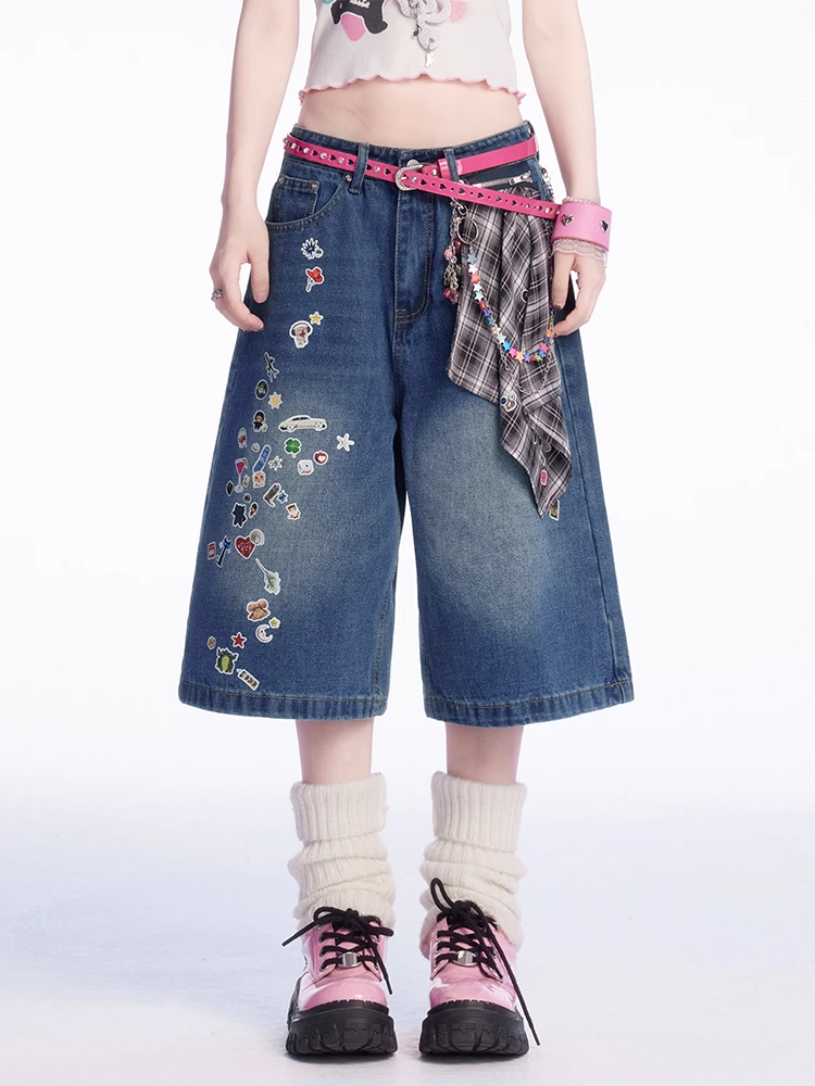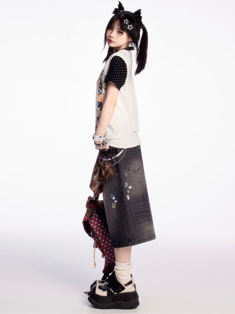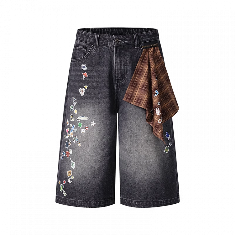 Schwarz/Blaue Vintage-Jeans mit weitem Bein und Cartoon-Aufkleber-Print und kariertem Accessoire