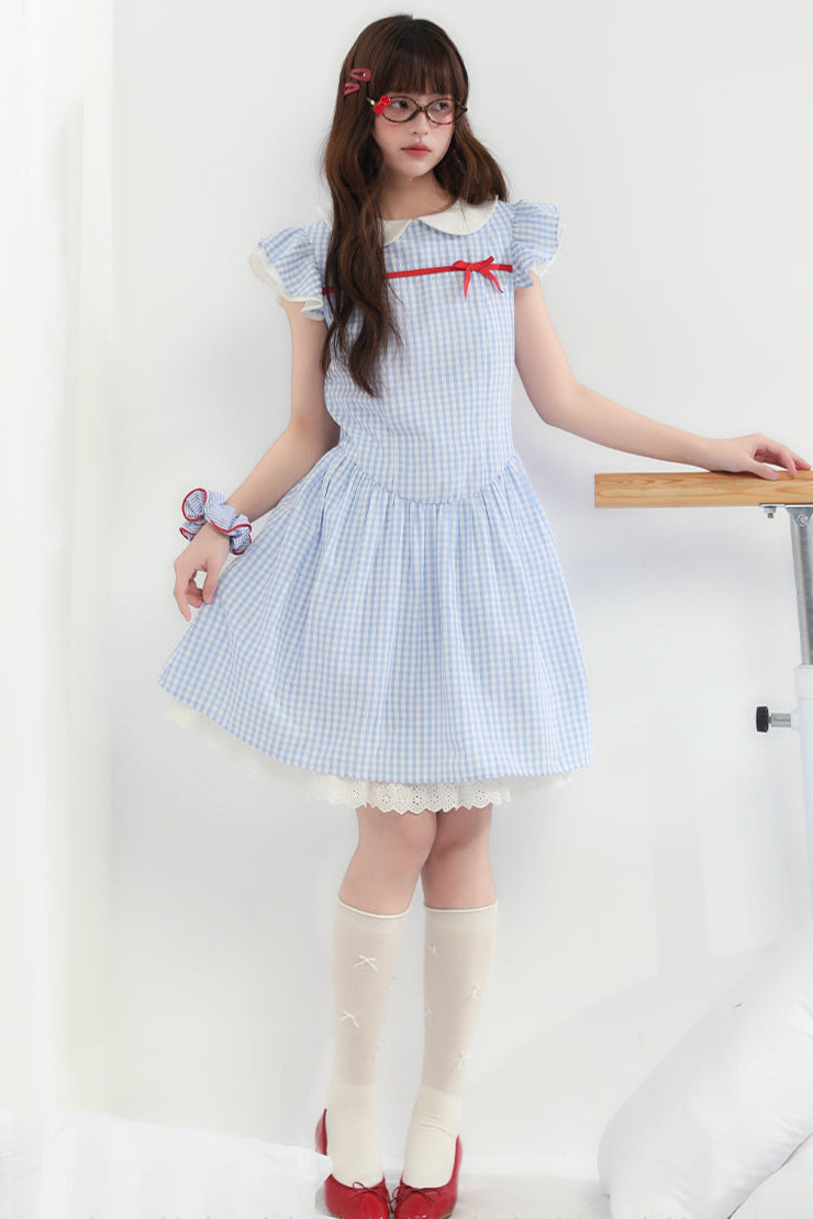 Blau-weißes Old School Lolita Fashion Kleid mit Schleife und Details, JSK-Set