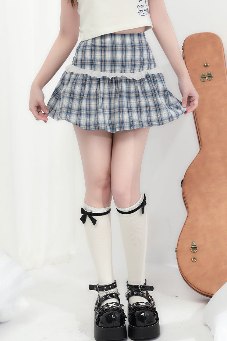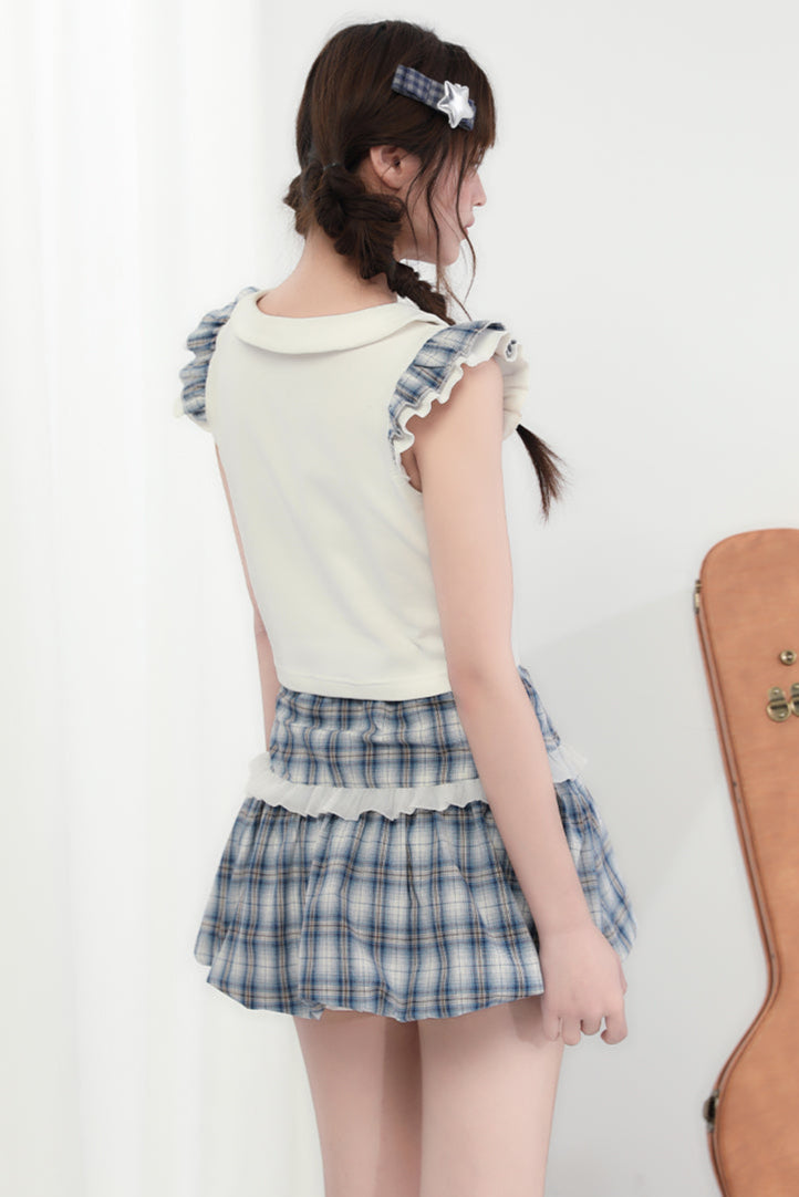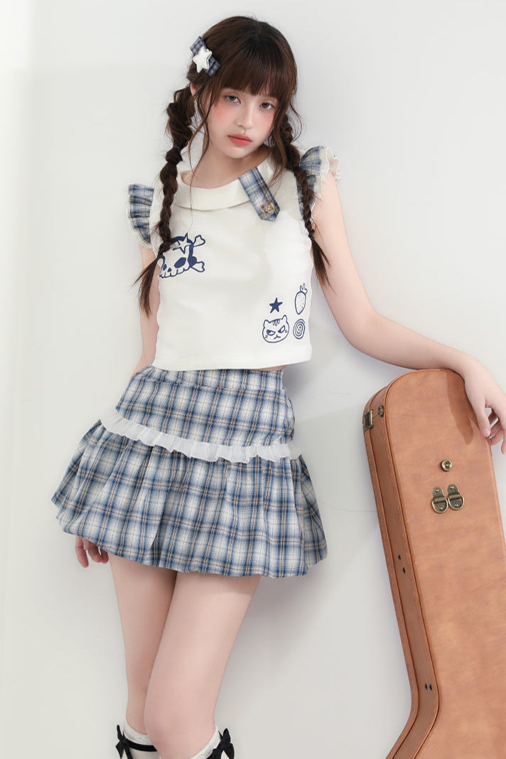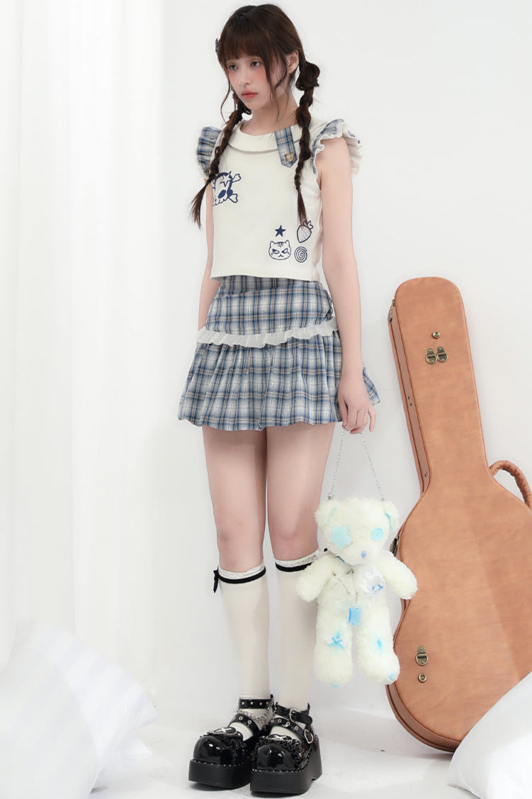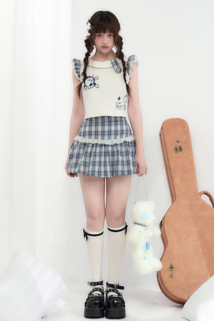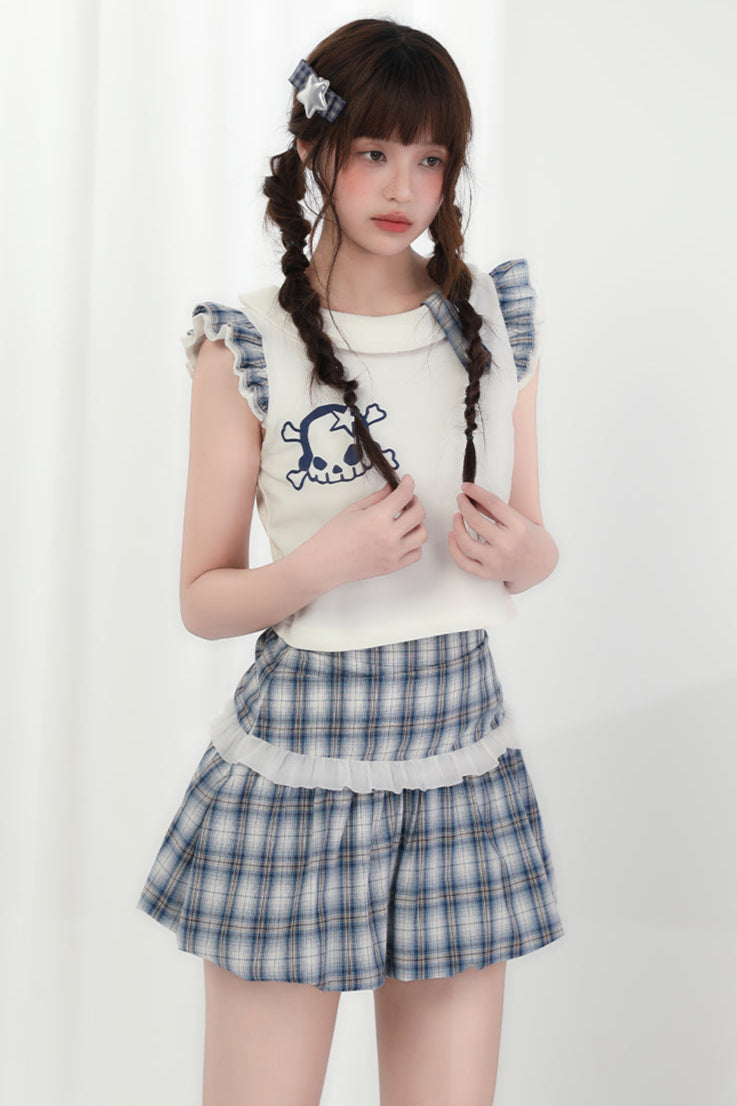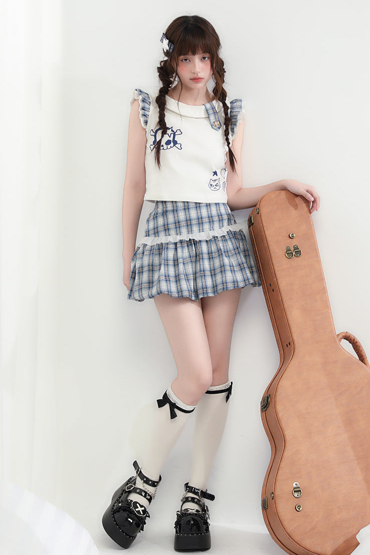 ❤Ärmelloses Oberteil mit Totenkopf-Katze + karierter Minirock❤