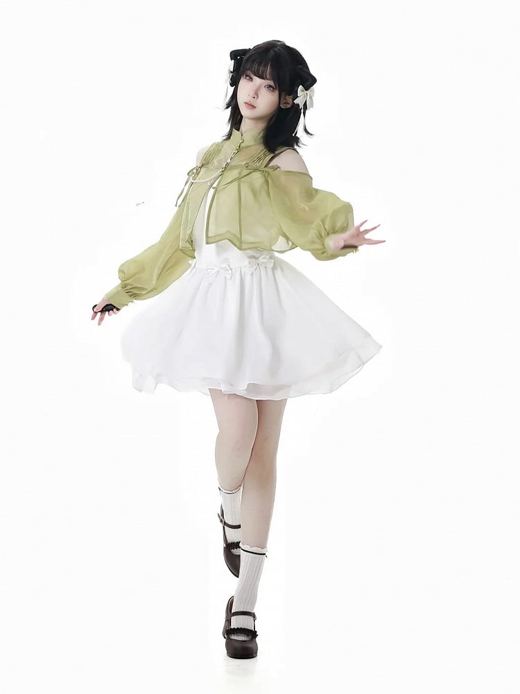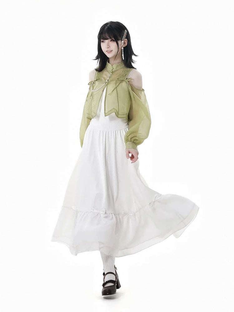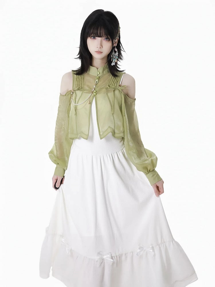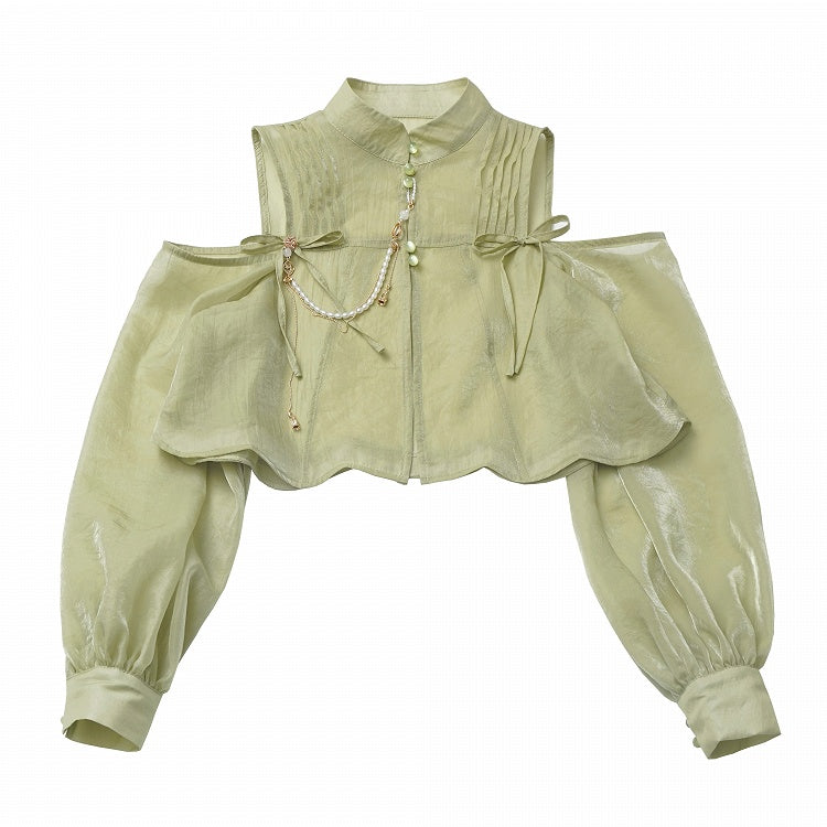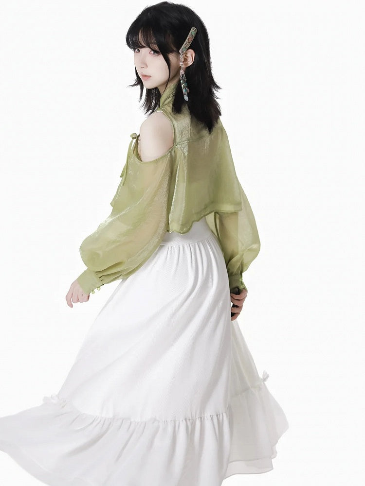Grünes, halbtransparentes Oberteil im Cheongsam-Stil mit ausgeschnittenen Schultern und gerüschtem Ausschnitt