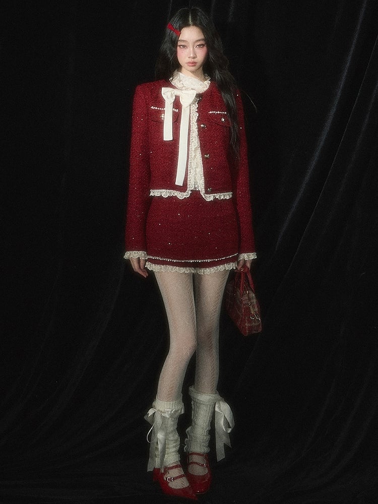 Entfesseln Sie Ihre festliche Stimmung mit unserer weihnachtlich roten Tweed-Kurzjacke! Die verspielte Schleife und der zarte Spitzenbesatz verleihen ihr einen Hauch von Charme, während die aufwendigen Perlendetails sie zu einem Hingucker machen. Perfekt, um Ihrer Weihnachtsgarderobe einen Farbtupfer zu verleihen.